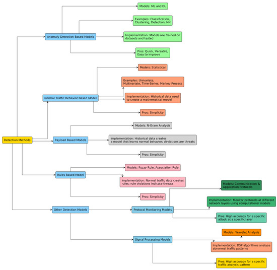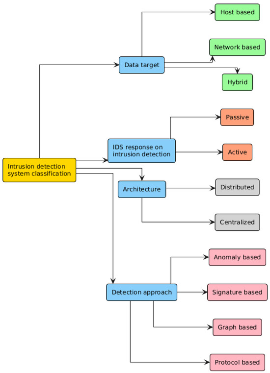 Certain research use specific protocols or frameworks for Botnet identification; however, these methodologies are not universally applicable due to the varying architecture employed by different Botnets [87,88]. The Bad Neighborhood approach is a prevalent tactic employed in Phishing Detection. It entails the identification of clusters of malicious IP addresses that are active throughout a defined period. Nevertheless, the practicality of this strategy is constrained by the pervasive occurrence of DDoS attacks and the complexities involved in establishing such clusters [89,90]. Figure 8 shows different IDS and their relationships with each other. Figure 9 show the categories of threat detection techniques [53,91,92,93,94,95].