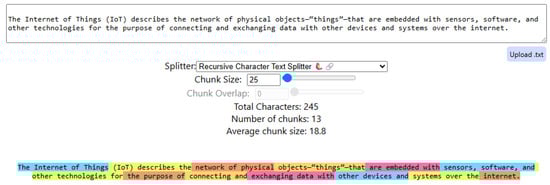 - LangChain. RecursiveCharacterTextSplitter. 2024. Available online: https://api.python.langchain.com/en/latest/character/langchain_text_splitters.character.RecursiveCharacterTextSplitter.html (accessed on 24 June 2025).
