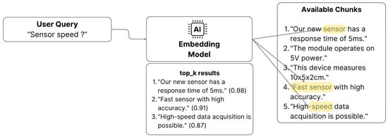 This study uses semantic search with cosine similarity to retrieve the relevant information from the vector database. The cosine similarity measures the angle between two vectors, indicating how similar they are. The smaller the angle, the more similar the vectors are, and thus, the more relevant the information is to the user query [45]. Figure 2 shows an example of the similarity and top-K ranked results from the chunked database with a similarity threshold of 0.3.