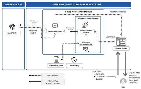 The sensor input setup assistance service for SEMAR utilizes generative AI and prompt engineering to simplify complex IoT setups for users with limited technical skills [5]. The service processes user input through an intent classifier, retrieves relevant information via RAG, and combines this with chat histories and SEMAR setup guides to provide step-by-step instructions for sensor connections, processing board configuration, and communication protocol setup. Figure 4 shows the system overview of the sensor input setup assistant service for SEMAR.