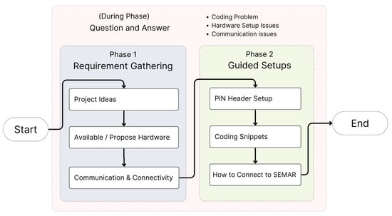 The prompt engineering techniques in the service are also designed to break down the setup process via step-by-step guidance phases, including a requirement gathering phase and a guidance phase. In the requirement gathering phase, users were asked about their project, hardware, and connectivity needs, while the guidance phase provides instructions on connecting hardware, coding, and linking to SEMAR using the selected connectivity. Figure 5 demonstrates how each phase directs generative AI to provide step-by-step guidance for configuring IoT devices.
