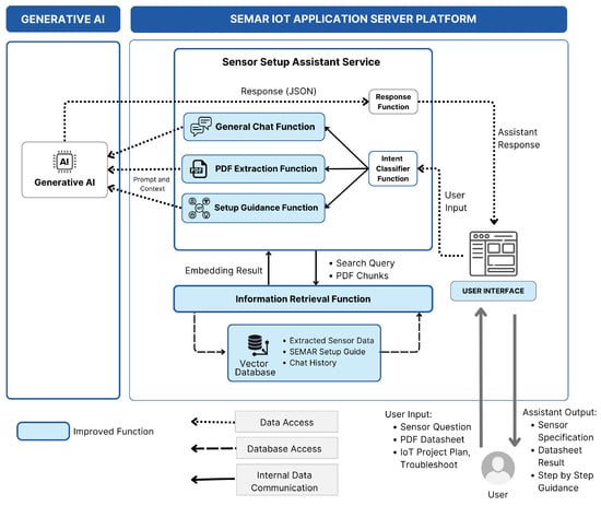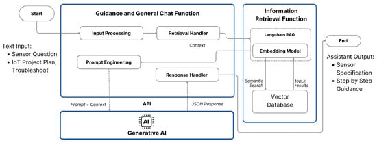A user can give input a question in text or upload a PDF datasheet of an unlearned sensor to the User Interface (UI). This input is then processed by the intent classifier function to identify the user intent, which is then routed to the appropriate function. If the user input is a question about a general IoT, common, or unlearned sensor, it is routed to the general chat function. PDF documents’ input is routed to the PDF extraction function to extract the information from the uploaded PDF datasheet. If the user input is a question about setting up an IoT project, it will be routed to the guidance function.
