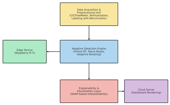 The system modules work in a step-by-step flow. First, the Data Acquisition and Preprocessing Unit collects raw network data and prepares it by cleaning and labeling it. This data is then sent to the Adaptive Detection Engine, where lightweight online models process it in real time and learn from new inputs. Once a threat is detected, the result and key features are passed to the Explainability Layer. This module uses SHAP to explain the decision, either on an edge device or through a cloud dashboard as shown in Figure 1. During the study design phase, the authors used Microsoft Copilot as a generative AI tool to assist with structuring and refining the methodological framework.