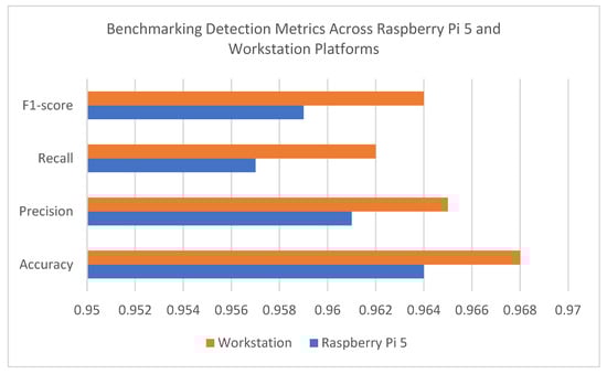 Detection effectiveness comparison (accuracy, precision, recall, F1-score) between Raspberry Pi 5 and the workstation.
