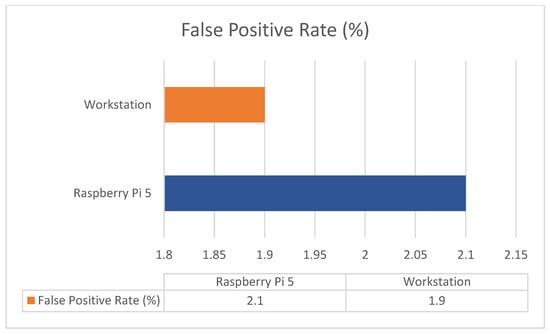 The false positive rate serves as a vital performance indicator for intrusion detection systems because high rates of false alarms create excessive work for analysts while damaging system trustworthiness. Raspberry Pi 5 produced 2.1% false positive rate results, while the workstation achieved a slightly better 1.9% rate. Raspberry Pi 5 produces a small number of additional false alerts, but its performance stays within operational limits because of its limited hardware capabilities, as shown in Figure 3.