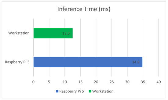 The system’s ability to classify data instances determines its inference time. Real-time reaction stands as a critical requirement for edge deployment. Raspberry Pi 5 processed data at an average speed of 34.8 ms, while the workstation processed data at 12.5 ms, according to Figure 4. The Pi 5 operates at a slower pace than the workstation yet meets real-time processing standards below 50 ms, which makes it suitable for edge-based intrusion detection.