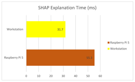The SHAP (SHapley Additive exPlanations) method provides interpretability, and its computational overhead was measured across a rolling window of 100 predictions. The explanation time per window averaged 55.3 ms on Raspberry Pi 5 and 31.7 ms on the workstation, according to Figure 5. The explanation generation delay on the edge device does not impact immediate threat detection and remains acceptable for asynchronous analyst review.