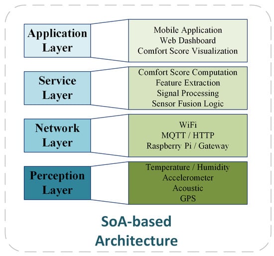 This section presents the materials and methods used to compute the comfort score in real time during a controlled ride along a school route. The system architecture is described, including the main hardware components and configurations. The architecture used in the developed IoT system is the SoA Architecture [,], which allows the system to be designed in modular layers, as illustrated in Figure 1. Each layer encapsulates specific functionalities, ranging from sensor data collection to user interaction, organized as independent, interoperable services. This architectural approach promotes high modularity, allowing each component to be developed, updated, or replaced without impacting the rest of the system. It also improves scalability and reusability, which are essential for adapting the platform to different school environments or extending it with new sensors and analytics modules. Furthermore, SoA improves integration with external systems, facilitating communication via standardized interfaces and supporting future interoperability within smart city or educational infrastructure frameworks.