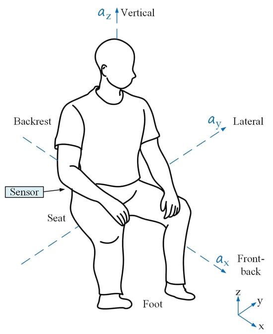 To align with the standard reference frame, Figure 3 illustrates the ISO 2631-1 reference axes for a seated subject. The three translational accelerations evaluated are as follows:
