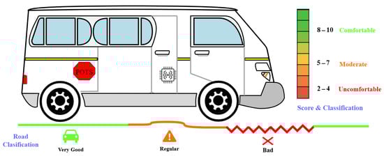Related studies identify mechanical vibrations as the most influential factor in comfort analysis [], while additional parameters such as temperature, humidity, noise, and speed also play a relevant role []. Building on these insights, this work introduces an IoT sensing platform that integrates accelerometers, environmental sensors, noise meters, and GPS modules to derive a comprehensive comfort index from multiple correlated variables, including vibration levels, travel time, and vehicle dynamics.