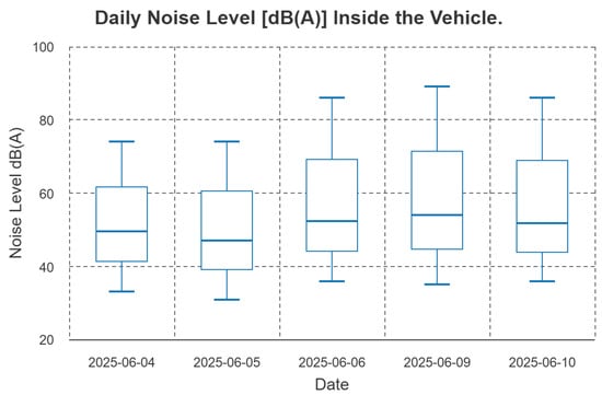 All acoustic data were recorded by the onboard application, which simultaneously provided real-time visual feedback. The collected data set was subsequently used for post-processing and temporal analysis to evaluate the accuracy of the developed decibel meter. The results of this analysis are presented in Section 4, including time series plots that illustrate dynamic noise profiles in different scenarios.