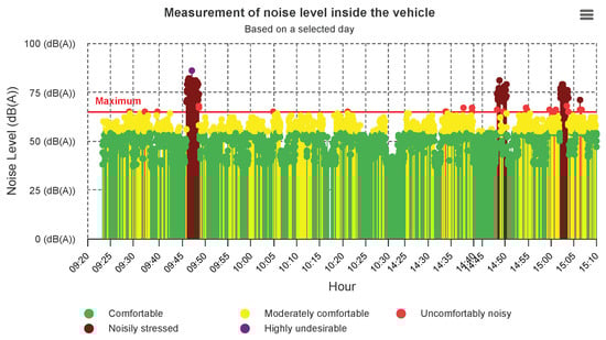 To evaluate the responsiveness of the monitoring system and simulate a range of real-world conditions, we introduced controlled acoustic variations inside the vehicle. This was achieved by using the vehicle’s onboard radio as an artificial noise source. The radio volume was adjusted at specific time intervals to simulate realistic scenarios such as background music, noisy conversations, or sudden spikes in ambient noise. These tests were conducted during actual school transport simulation routes, allowing a representative collection of environmental data.
