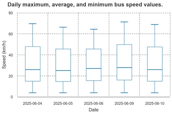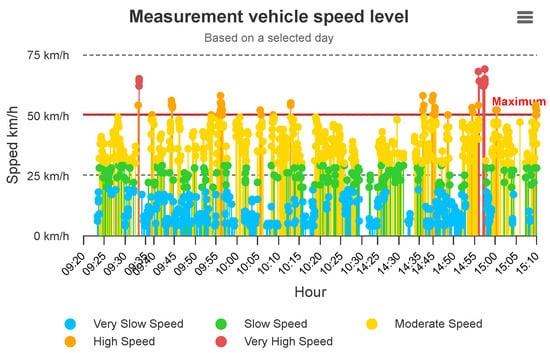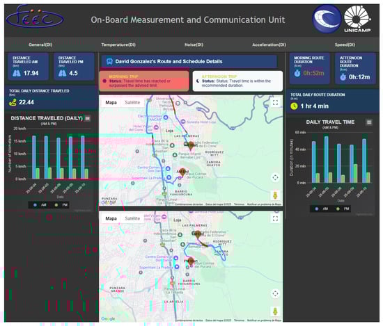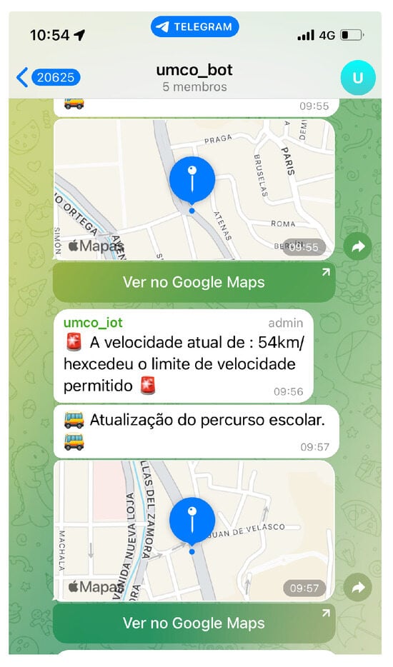 To determine the route paths, a realistic emulation of vehicle trajectories was performed, simulating trips from an educational center to several homes distributed throughout various city sectors and vice versa. The objective was to log the routes, evaluate the comfort scores in multiple parameters, record travel times, and assess the vehicle velocity along each route. Six homes were designated as student pickup points, each equipped with an RFID system for identification. The speed of the vehicle was continuously monitored to detect instances of overspeeding. Although there is no universally accepted standard for the speed of school transport, Braz et al. [] reports an average operational speed of 32 km/h. In contrast, Ecuadorian legislation [] specifies that public transport in urban areas should adhere to speed limits ranging from 40 to 50 km/h, and up to 60 km/h in peripheral zones. Importantly, in school zones, the limit is reduced to 20 km/h. Consequently, the system was configured to trigger alert notifications via a Telegram application whenever the vehicle exceeded the 50 km/h threshold during testing.