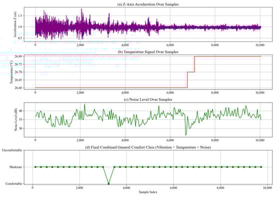 Similarly, Castellanos and Fruett [] developed an embedded system that combines hardware, firmware, and software to monitor dynamic vehicle behavior. Their system measured acceleration and jerk (the rate of change in acceleration) to detect discomfort events and compute a Comfort Index based on ISO 2631-1 guidelines. Their dual-algorithm strategy provided both average comfort metrics and real-time event localization, with on-board user feedback used for threshold calibration.