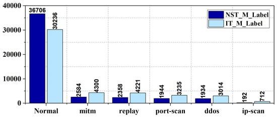 The dataset is labeled with binary and multi-class attack classifications based on two strategies: Injection Timing (IT) and Network Security Tools (NST). Classes and their impacts are given in Table 3 and the distribution is given in Figure 2. IT_B_Label and NST_B_Label features classify traffic as usual or attack, while the IT_M_Label and NST_M_Label specify attack types such as port-scan, DDoS, Man-in-the-Middle, and replay attacks. This labeled structure supports the development of machine learning models for anomaly detection and cyber threat monitoring in ICS environments. This moderate imbalance could potentially influence model performance, particularly precision and recall metrics. While the imbalance was not explicitly corrected through resampling methods such as SMOTE or undersampling, we addressed it by monitoring classification performance using precision, recall, and F1-score. These metrics provided a more balanced evaluation across all classes. We acknowledge that integrating balancing techniques in future work may further improve robustness.