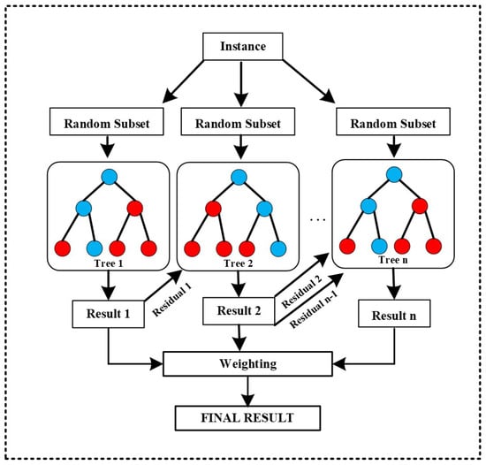 where T indicates the total number of tree leaves, represents regularization parameter, and denotes the weight provided to each leaf. The architecture of the XGBoost classifier showing the ensemble of Decision Tree is shown in Figure 3.