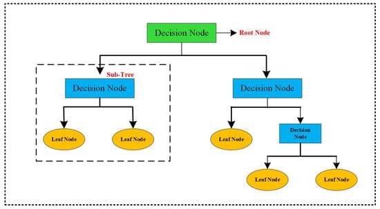 The model uses recursive partitioning, and for a classification problem, the ultimate class prediction at a leaf node is determined as , where is the predicted class and is the proportion of samples belonging to class i in that node. The structure of a Decision Tree classifier with root, decision, and leaf nodes is shown in Figure 4. Pruning methods, especially cost-complexity pruning, maximize tree depth and accuracy by minimizing as shown in Equation (9):