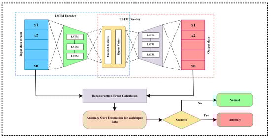 where represents the weight matrix associated with the feature transformation function. represents the weight matrix associated with the classification function. The ∘ (circle) operator denotes the element-wise multiplication (Hadamard product) between two matrices or vectors and LSTM autoencoder architecture for anomaly detection using reconstruction error thresholding is shown in Figure 5.