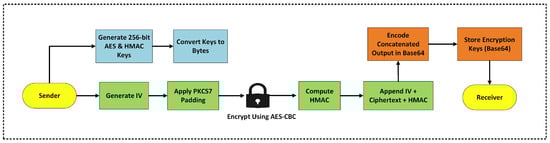 AES-CBC encryption [45] with HMAC integrates two cryptographic components—AES for confidentiality and HMAC for integrity—into a resilient framework that ensures data confidentiality and tamper evidence. The encryption flow diagram is shown in Figure 6 and the corresponding pseudocode is given in Algorithm 1.
