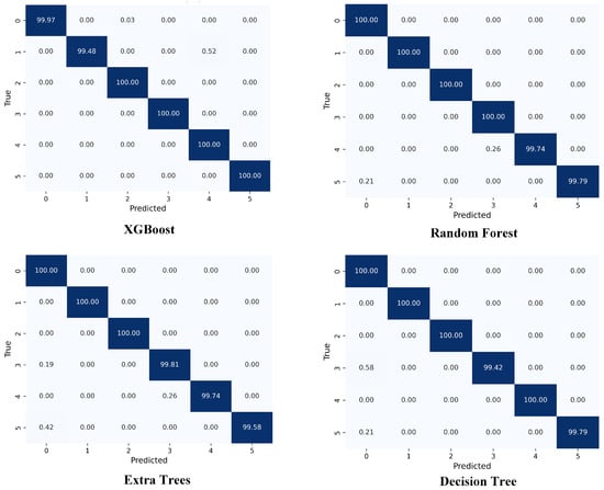A Decision Tree (DT) is a hierarchical model used for classification and regression [40,41]. It divides data according to feature values to generate decision nodes, which produce final predictions at the leaf nodes. The splitting criterion is determined by measures such as Gini impurity and entropy.