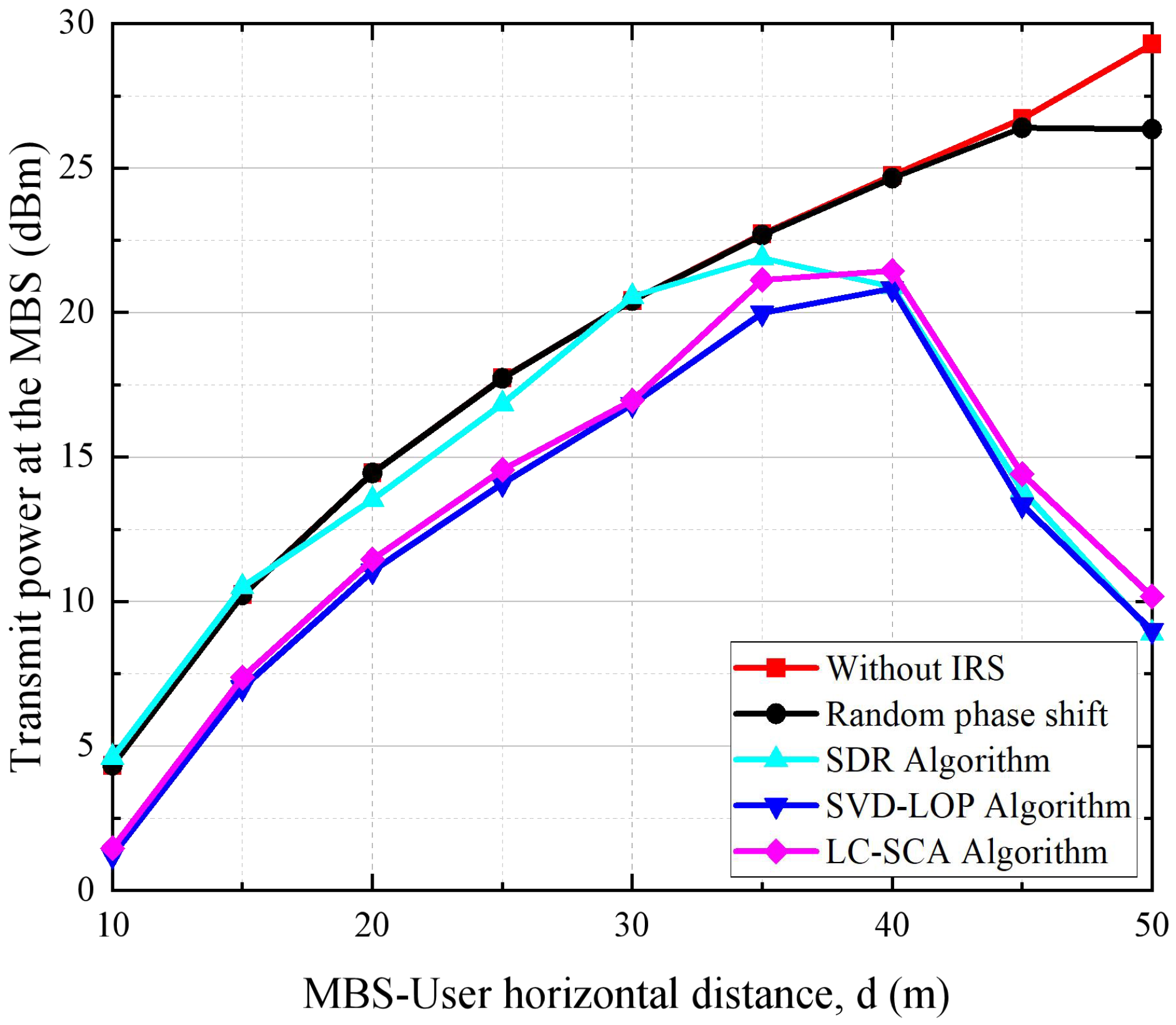 . It can be observed that for the scheme without IRS, the transmit power increases rapidly as the user moves away from the MBS, while for the IRS-assisted schemes, the transmit power first increases and then decreases as the user approaches the IRS. This demonstrates that deploying IRS can effectively reduce transmit power and expand signal coverage without installing additional active relays in the coal mine tunnels. However, the IRS random phase scheme shows almost no significant improvement compared to the proposed SVD-LOP, LC-SCA, and SDR algorithms, which highlights the necessity of IRS phase optimization. For these three algorithms, when