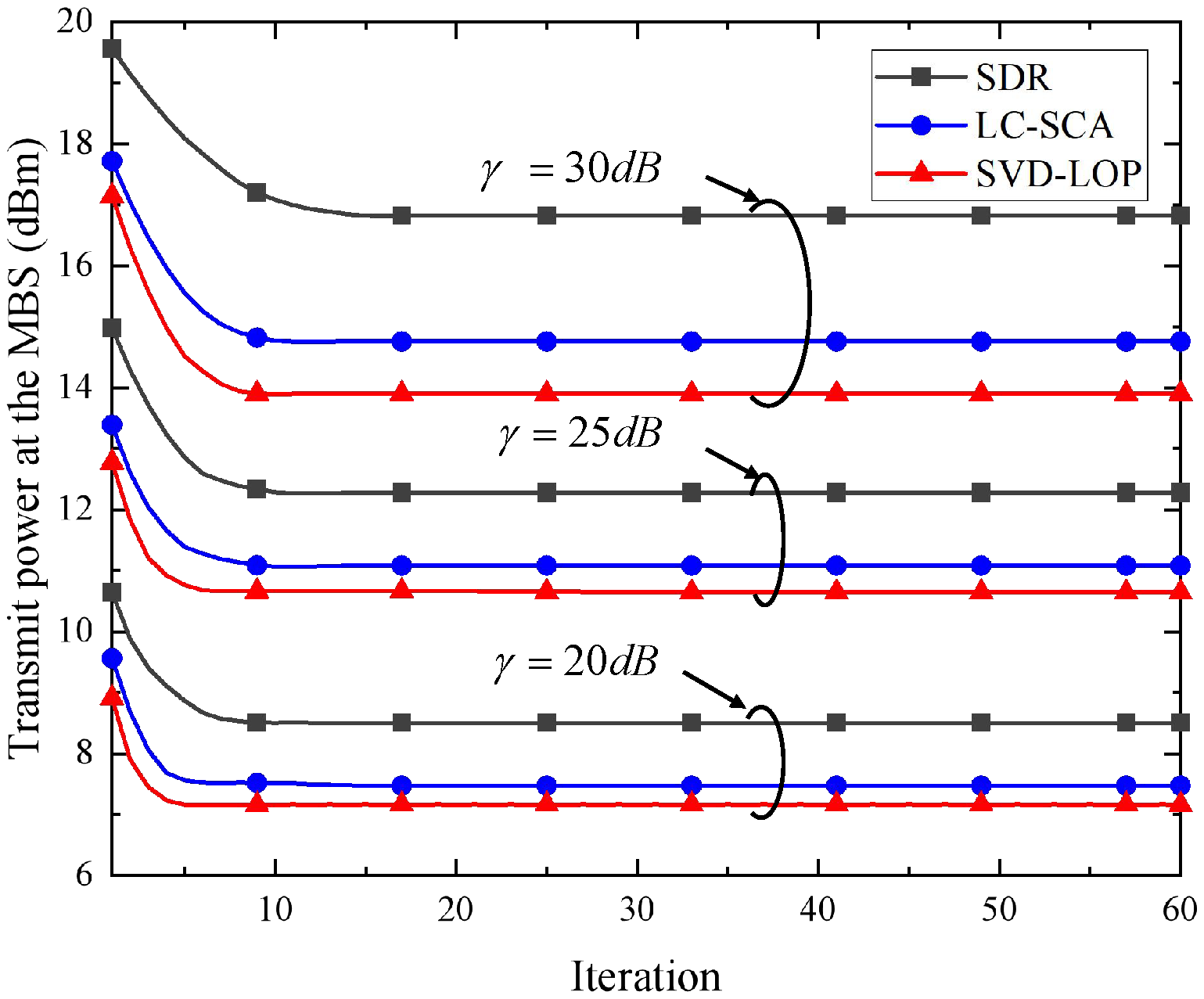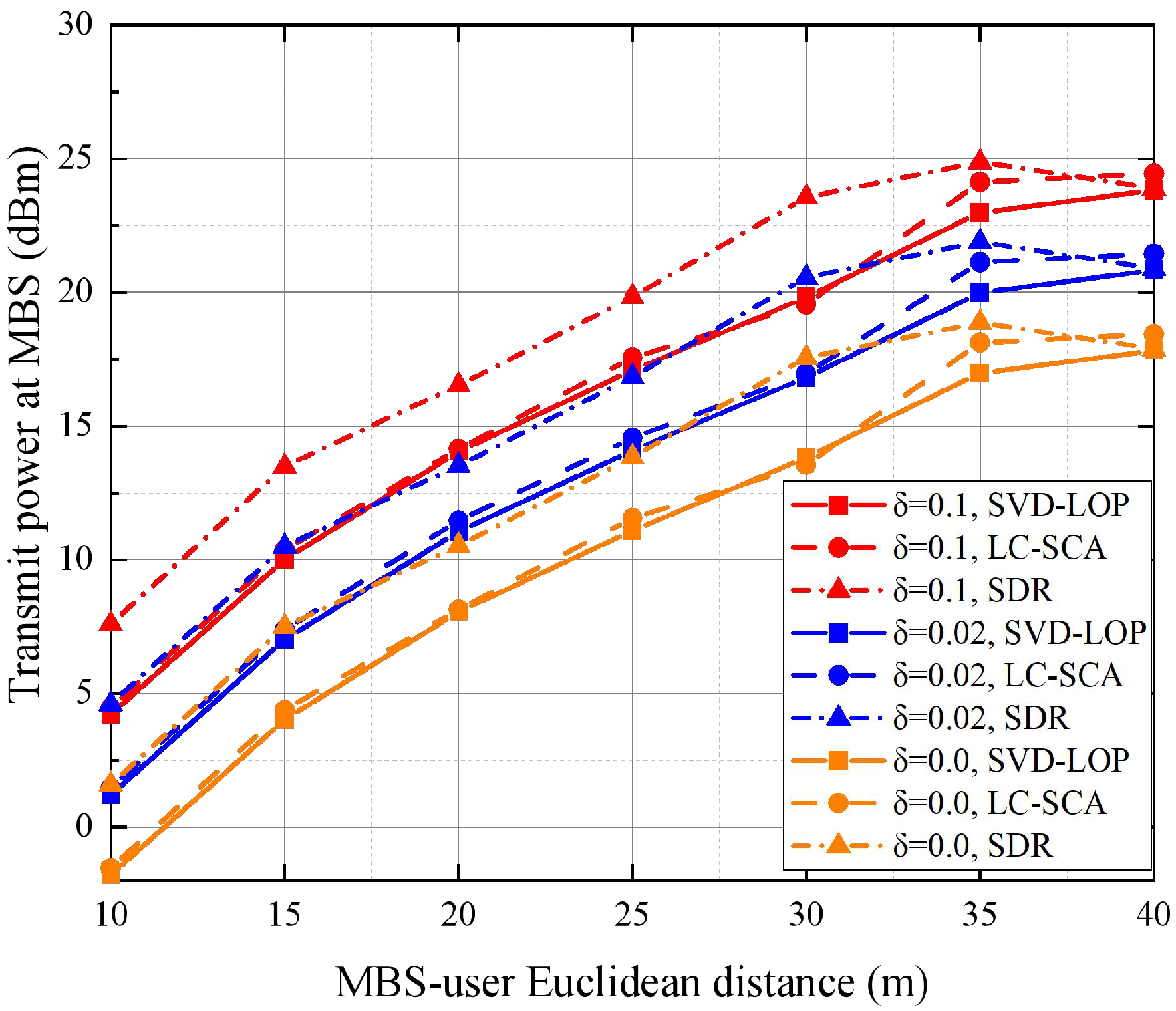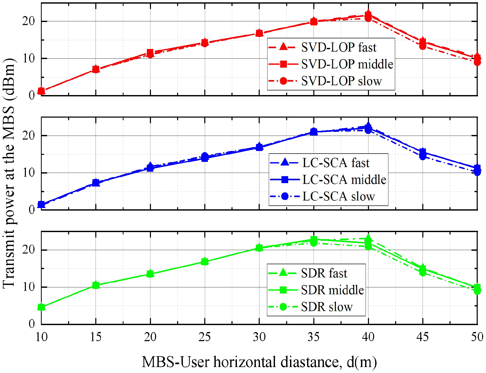 increases, transmit power at MBS also increases, as expected. However, regardless of the roughness, the proposed SVD-LOP and LC-SCA algorithms consistently achieve lower transmit power than the SDR algorithm, which validates the effectiveness of the SVD-LOP and LC-SCA algorithms in coal mine scenarios.