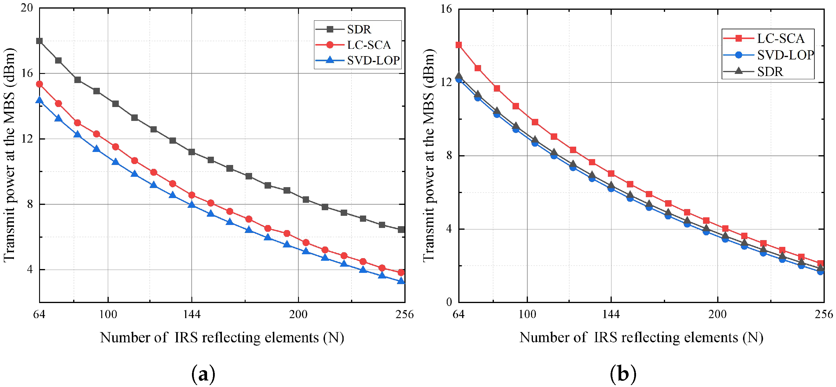 , as the number of IRS reflecting elements increases, the performance of the SVD-LOP and SDR algorithms becomes nearly identical, while the performance gap between LC-SCA and the other two schemes continues to narrow, with all three algorithms showing significantly lower transmit power than the threshold. Although the SDR algorithm has a certain capability in optimizing transmit power, its computational complexity reaches