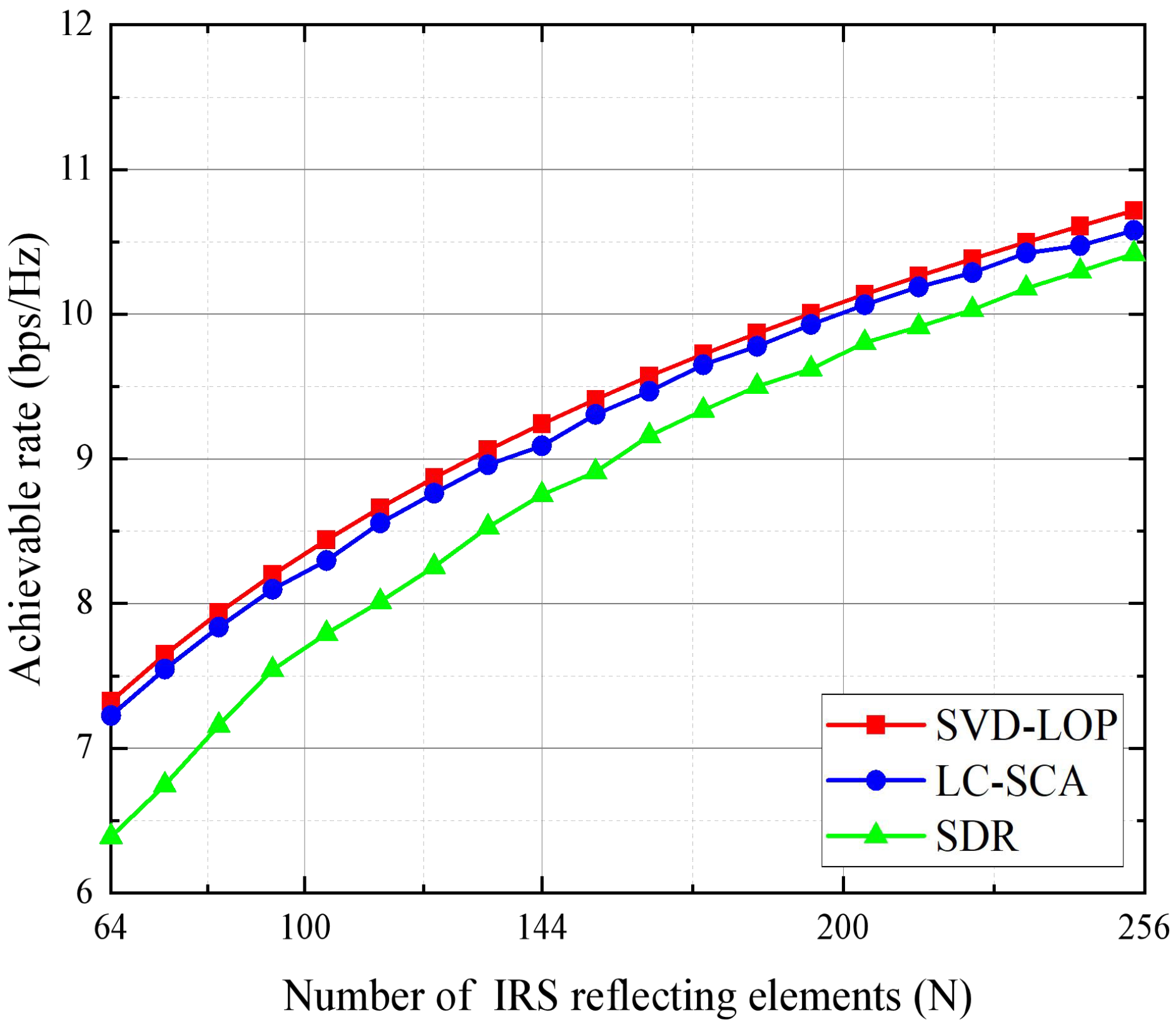 , lower than the threshold. As expected, the achievable rate increases steadily with the number of IRS reflecting elements. It is obvious that the SVD-LOP algorithm consistently achieves the highest achievable rate, demonstrating its effectiveness in leveraging IRS phase-shift gains through channel matrix decomposition. The LC-SCA algorithm achieves comparable performance and closely follows SVD-LOP in most cases, which indicates its ability to maintain rate performance and significantly reduce computational complexity. In contrast, the SDR algorithm exhibits inferior performance. Simulation shows the proposed SVD-LOP and LC-SCA algorithms can optimize the achievable rate with low complexity, which makes them suitable for resource-limited environments such as coal mine communication.