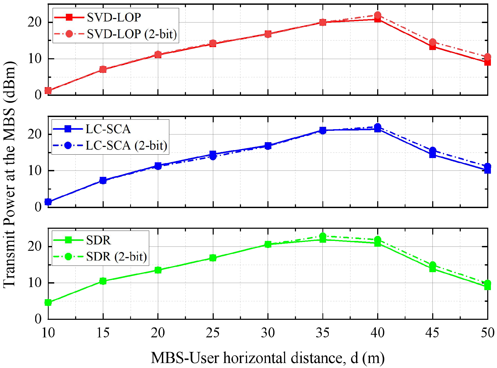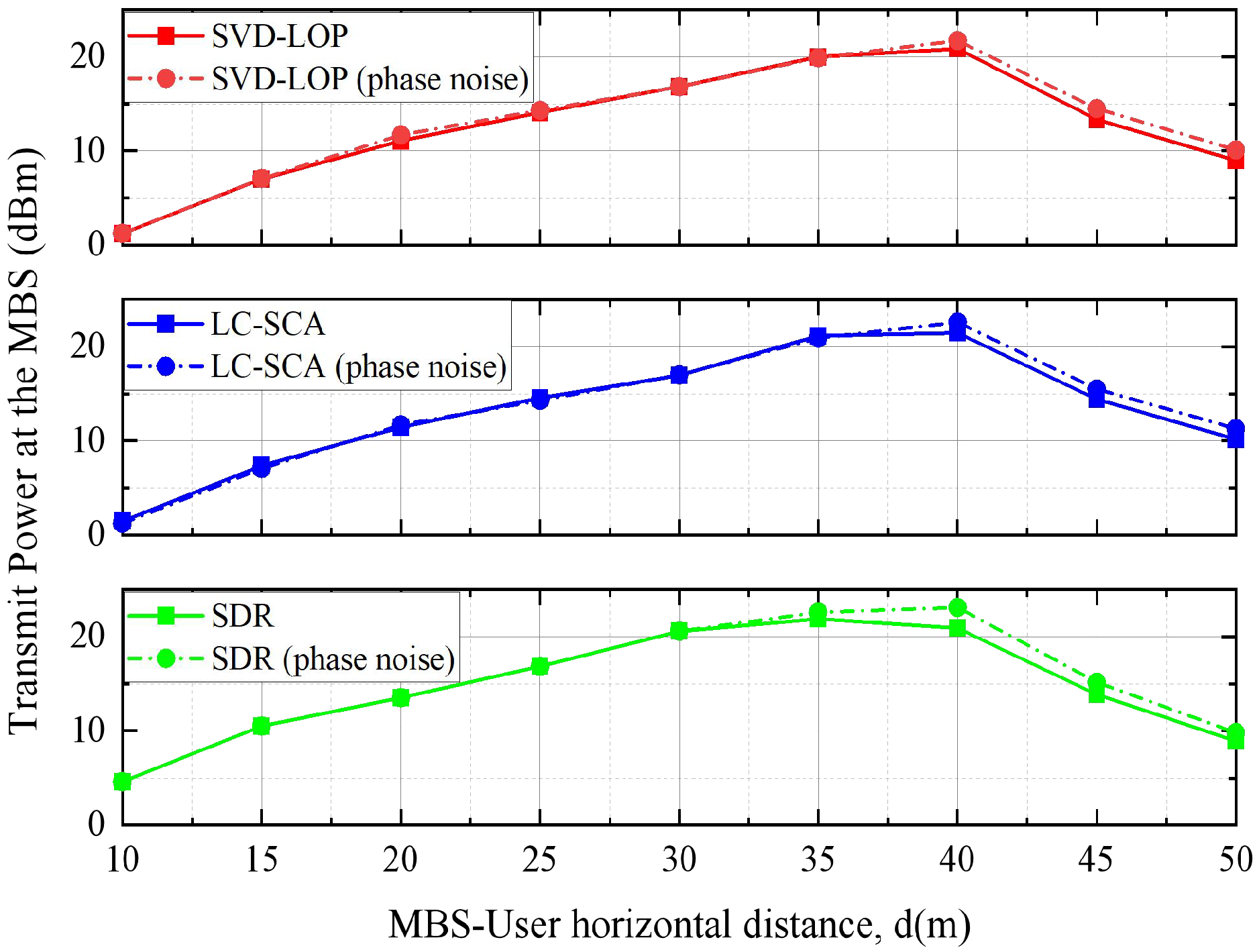 Figure 11. It indicates that the MBS transmit power slightly increases under the same phase noise condition. However, both the proposed SVD-LOP and LC-SCA algorithms consistently outperform the SDR algorithm in the presence of identical phase noise. The peak transmit power under phase noise is