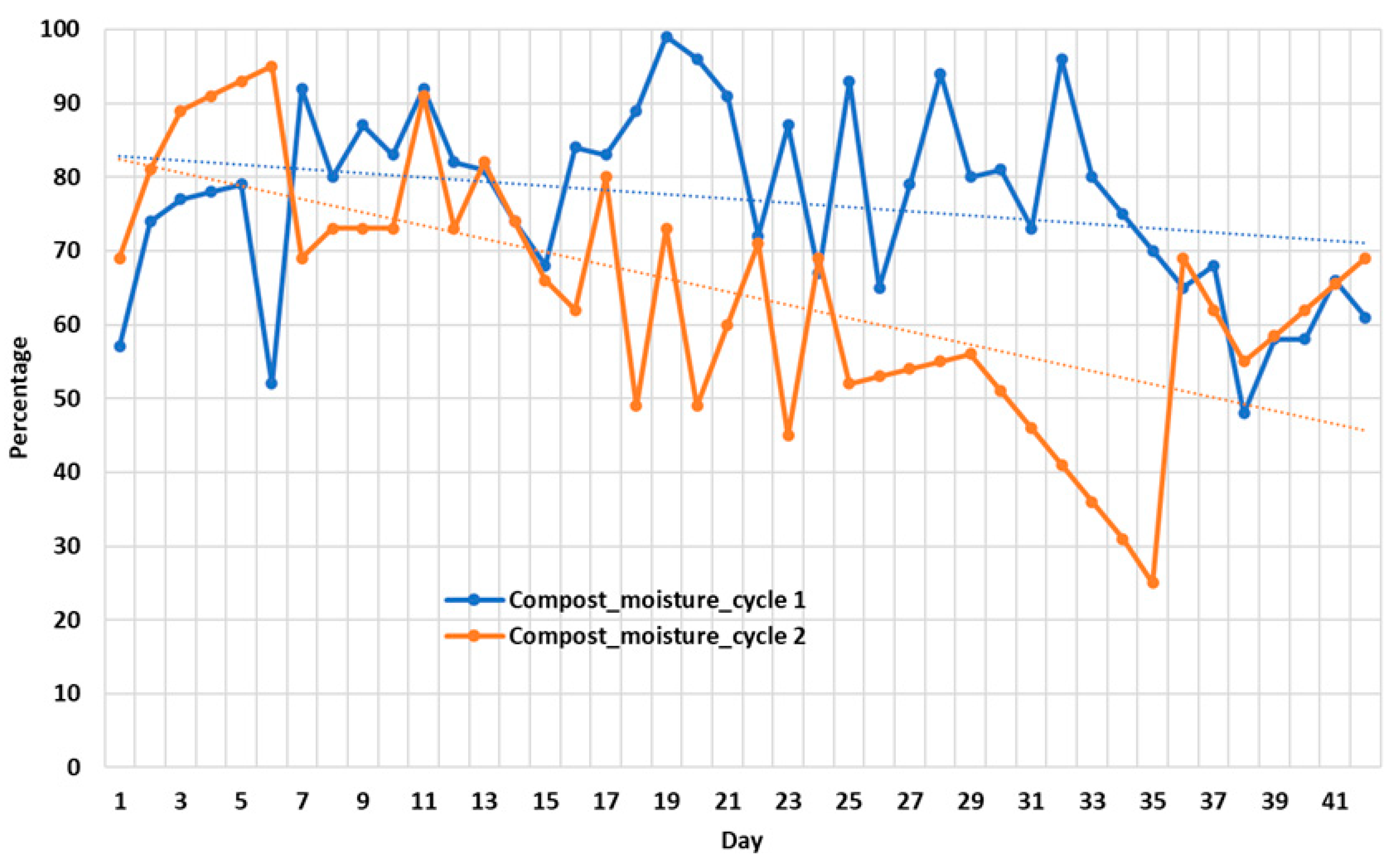 - Hemidat, S.; Jaar, M.; Nassour, A.; Nelles, M. Monitoring of Composting Process Parameters: A Case Study in Jordan. Waste Biomass Valoriz. 2018, 9, 2257–2274. [Google Scholar] [CrossRef]