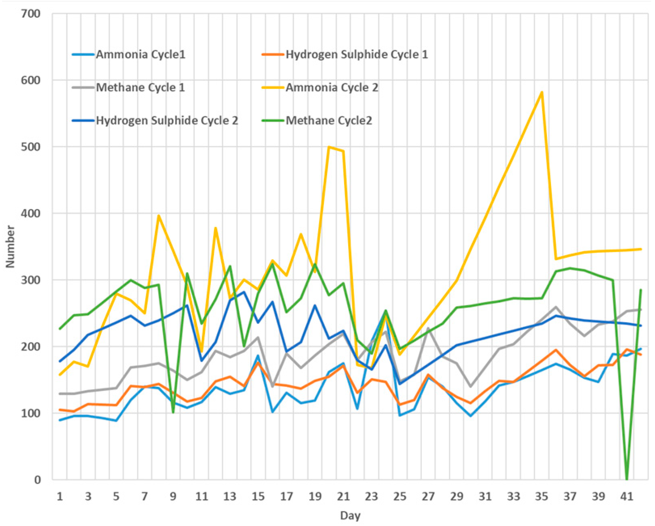 | Hydrogen Sulfide—Compost Temperature | −0.65 | −0.07 |