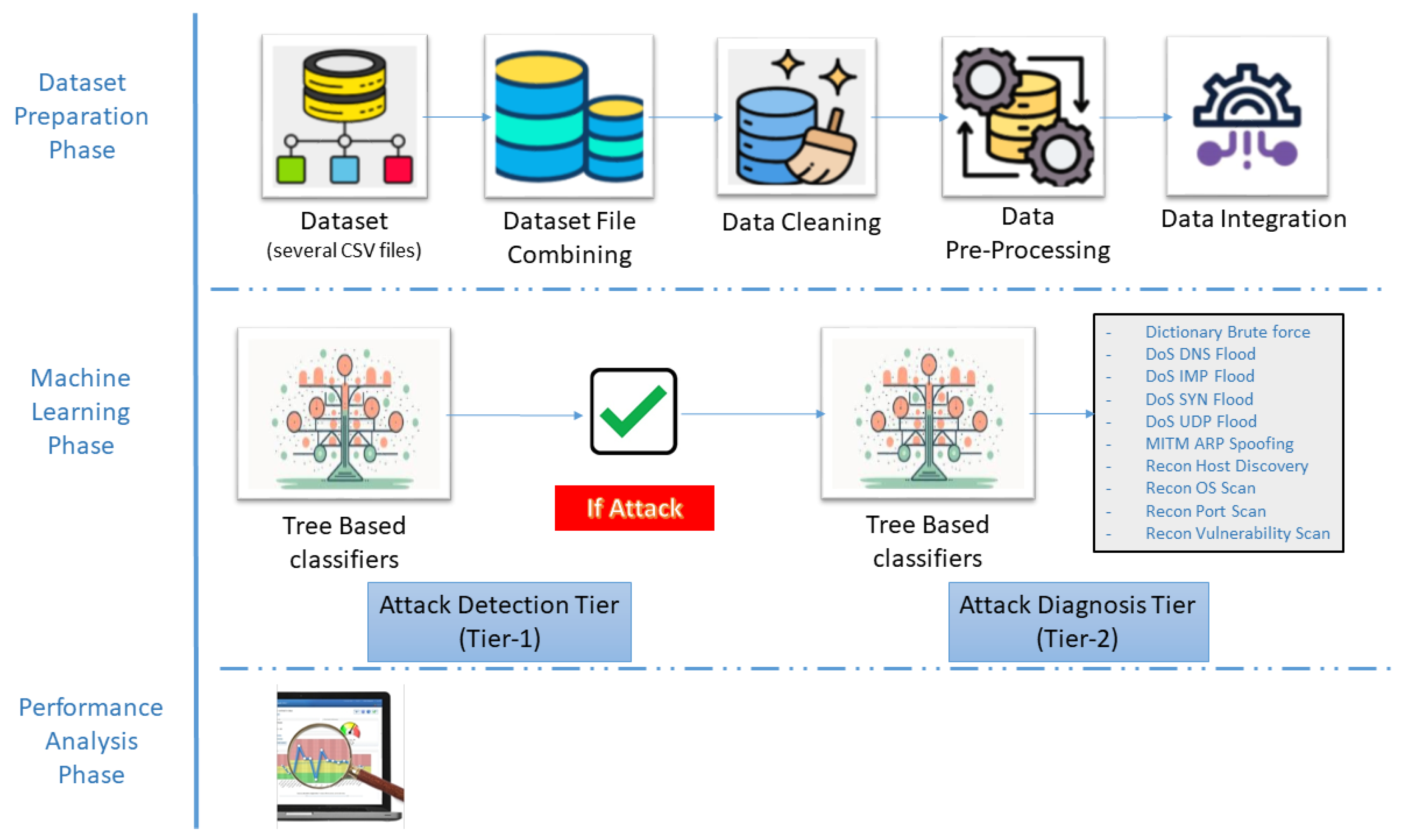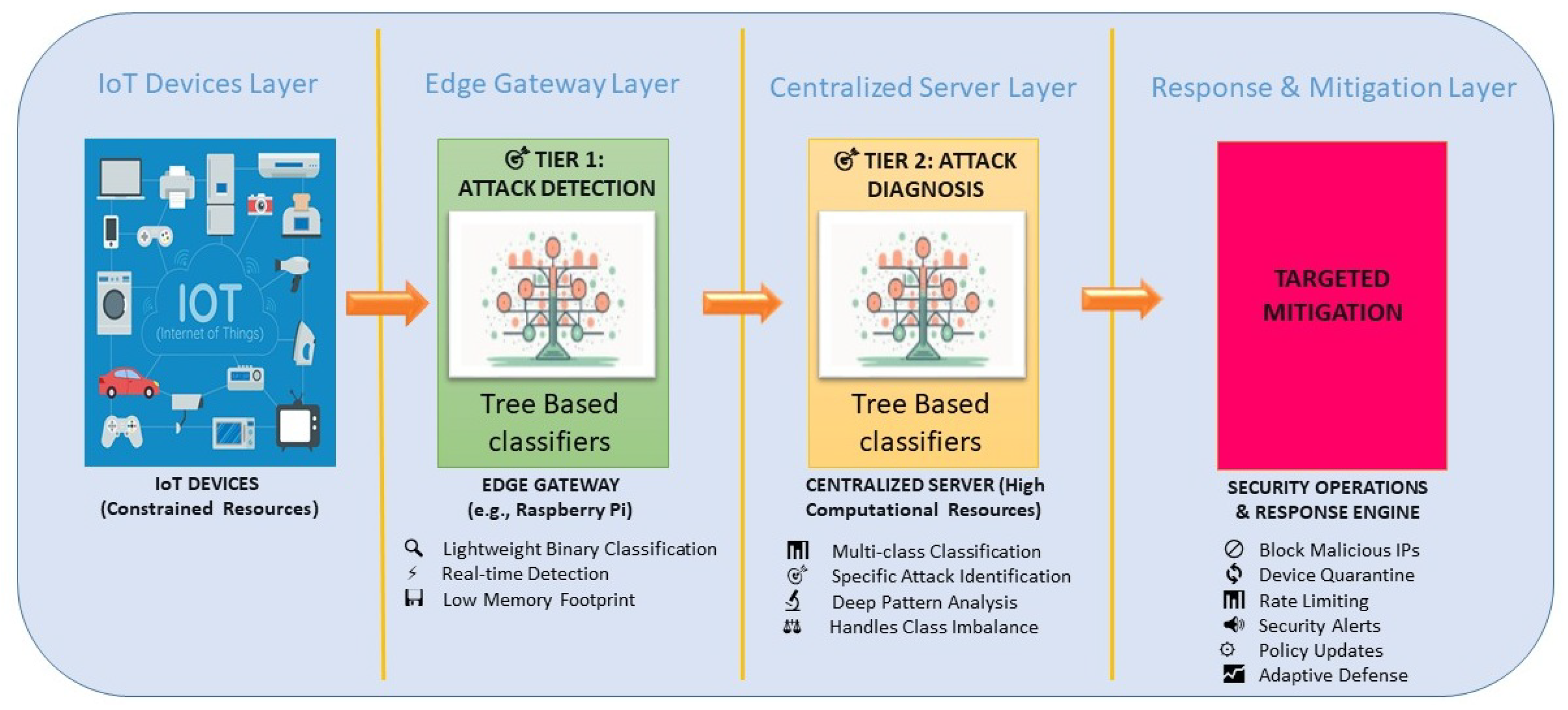 12]. To address these specific limitations, this paper presents the Centralized Two-Tiered Intrusion Detection System (C2T-IDS). The proposed framework is tailored for IoT settings, integrating centralized analytical power with the computational efficiency of tree-based ML to deliver a scalable and robust threat detection solution.