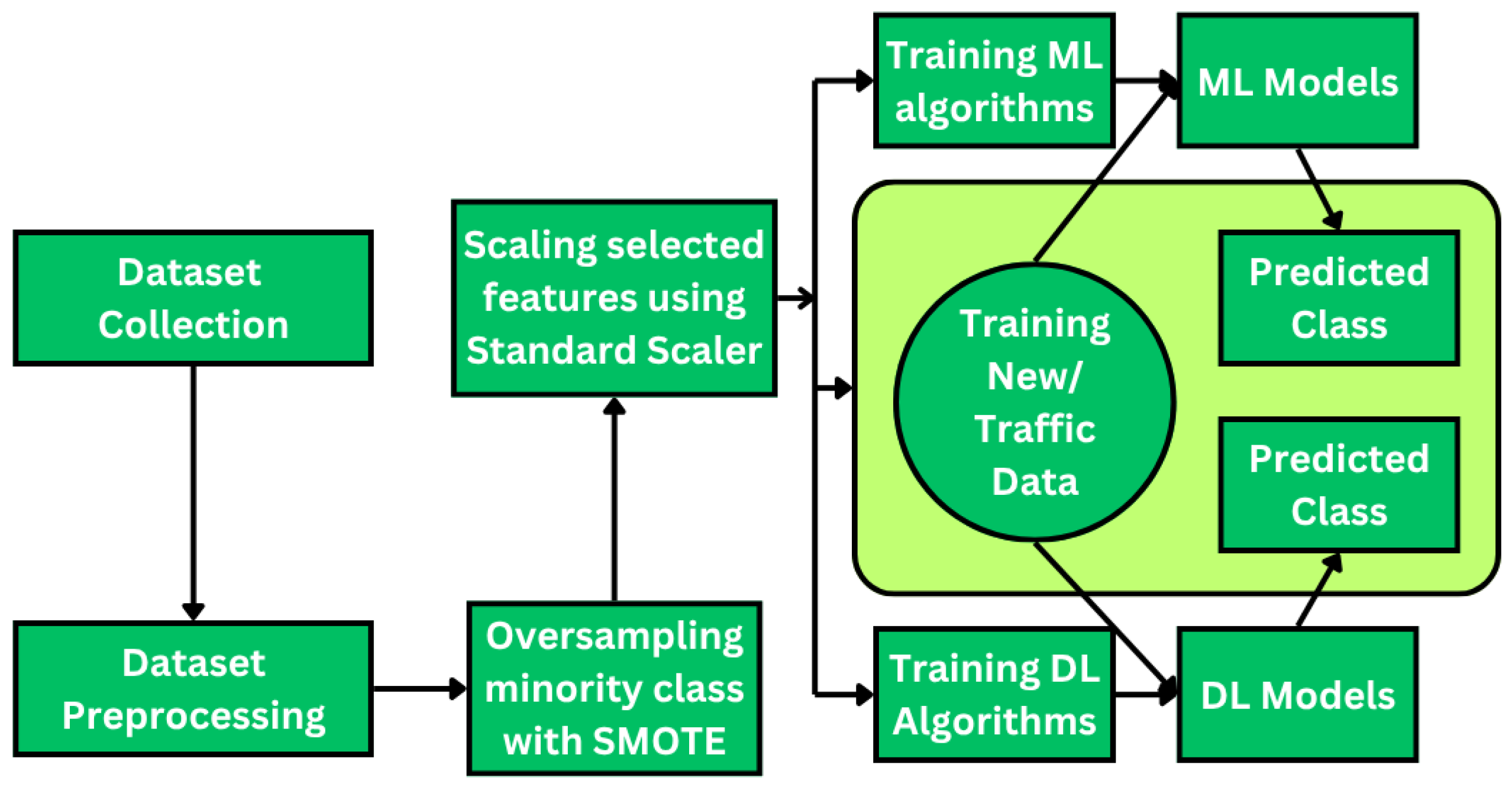 19]. The average recall percentages and FPRs for SVM, DT, and random forests are shown in the paper as 83.1%, 89.6%, and 84.9% respectively, offering insights into the efficacy of these classifiers. The results imply that botnet traffic identification accuracy may be improved, resulting in a notable decrease in FPRs. The authors specifically highlight the possibility of using DL techniques for these kinds of categorization issues in further studies. Utilizing a basic amount of dataset features such as flow size in bytes and packets, flow inter-arrival periods, and counts of illegal TCP flows is the main goal of the suggested technique. In addition to improving detection efficiency, this condensed feature set indicates room for future development in the field of ML-based automated botnet traffic identification.