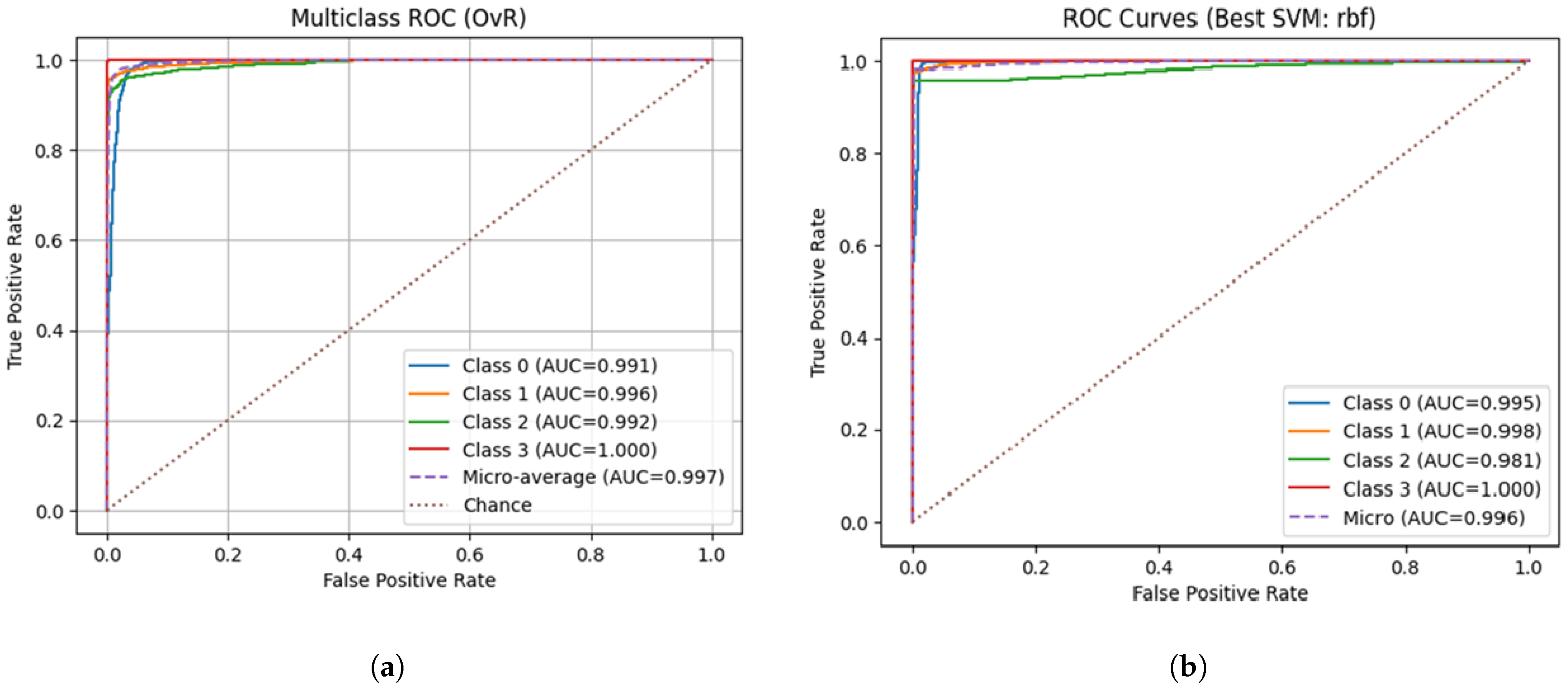 The tuning process explored different kernel types, regularization strengths (C), and kernel coefficients ( γ ). The optimal configuration selected by Optuna used an RBF kernel with C = 194.9488 , γ = 0.6393 , class_weight = balanced, tol = 1 × 10 3 , and max_iter = 100,000. The large C enforced a stricter decision boundary that correctly classified more samples, while the moderate γ produced a smoother boundary that reduced over-fitting. The balanced class weighting further improved fairness between majority and minority classes.