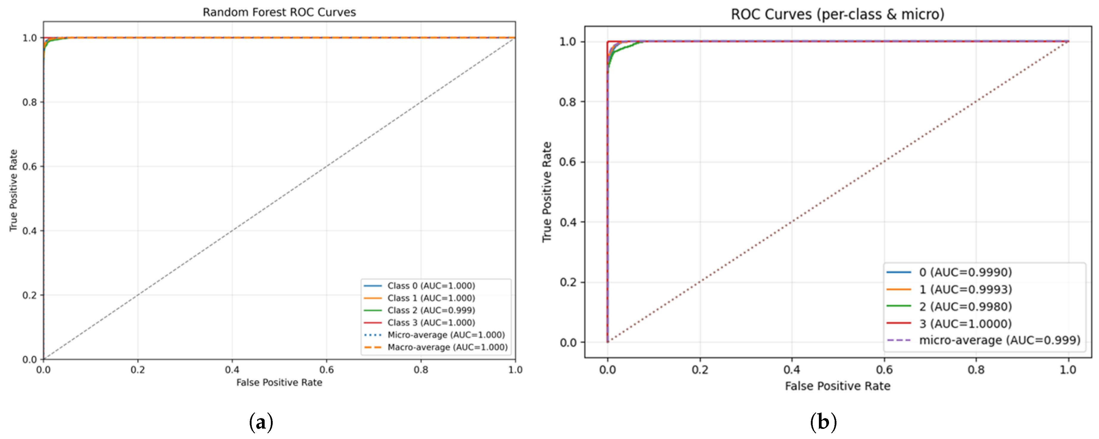 Prior to model construction, a correlation analysis was performed to determine the relationships between the features and the target variable. This step is essential in the ML process, as it provides an initial understanding of the data and identifies which features are most closely related to the target variable. In this analysis, the correlation ratio ( η 2 ) was employed to quantify the strength of each numerical feature in relation to the nominal target attribute. A value closer to 1.0 indicates a stronger predictive relationship. The results, as shown in Table 3, indicated that features such as idle_listen and all_transmit exhibited high correlation, while others, such as transmit, showed weaker correlation. Despite these variations, all models were trained on the complete feature set, and their satisfactory performance demonstrates that they successfully identified complex, non-linear patterns and feature interactions that a straightforward correlation analysis could not capture.