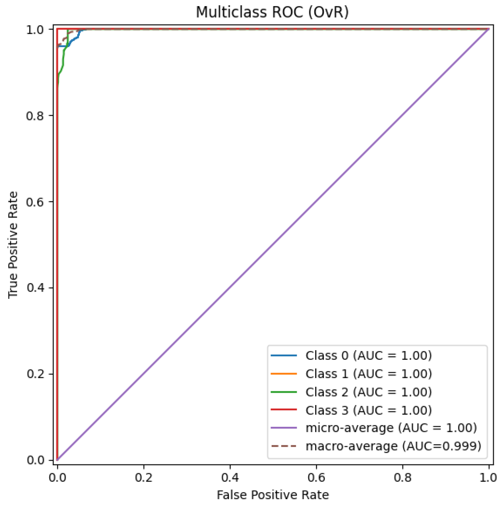The prepared dataset contains four classes with the following distribution: Class 0 (non-compromised motes): 25,773 instances; Class 1 (UDP-flood attack victims): 12,981 instances; Class 2 (wormhole-attack victims): 12,959 instances; and Class 3 (externally generated legitimate-request attack victims): 6312 instances. The class imbalance is attributed to the fact that non-compromised motes were present in all three attack simulations. While the UDP-flood and wormhole attacks generated a comparable number of records, the externally generated legitimate-request attack produced fewer instances due to external-thread management constraints and the simulator’s limited capacity to handle a large number of concurrent threads, which restricted the number of nodes in that simulation.