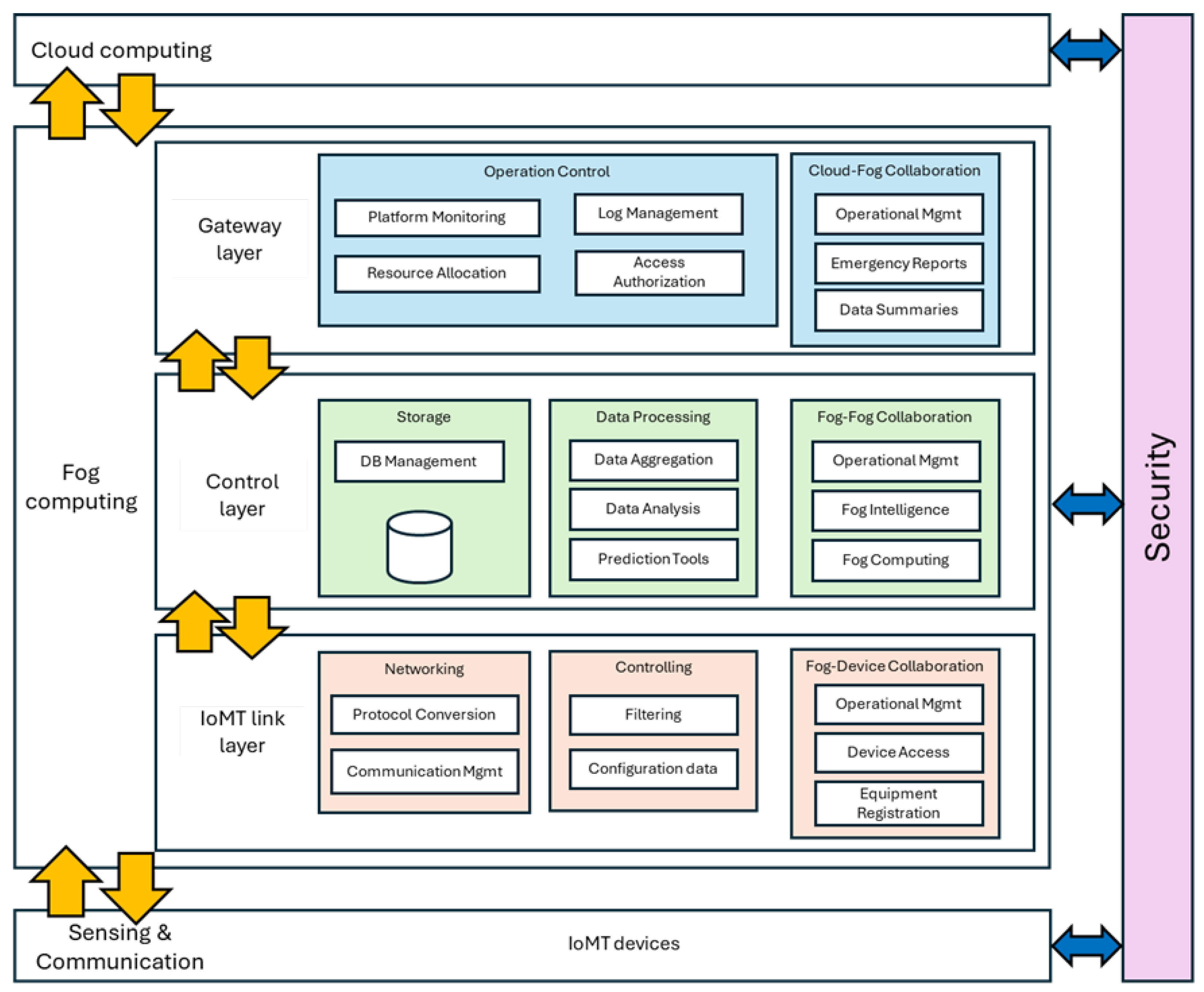 The IoMT link layer manages direct communication with the sensing devices. It collects data using various protocol drivers, performs initial filtering and integrity checks, and supports real-time bidirectional control. Given the heterogeneity of IoMT devices, this layer is designed to support multiple communication standards and device types. It also handles device registration, access control, and security, enabling the fog node to act as a versatile gateway.