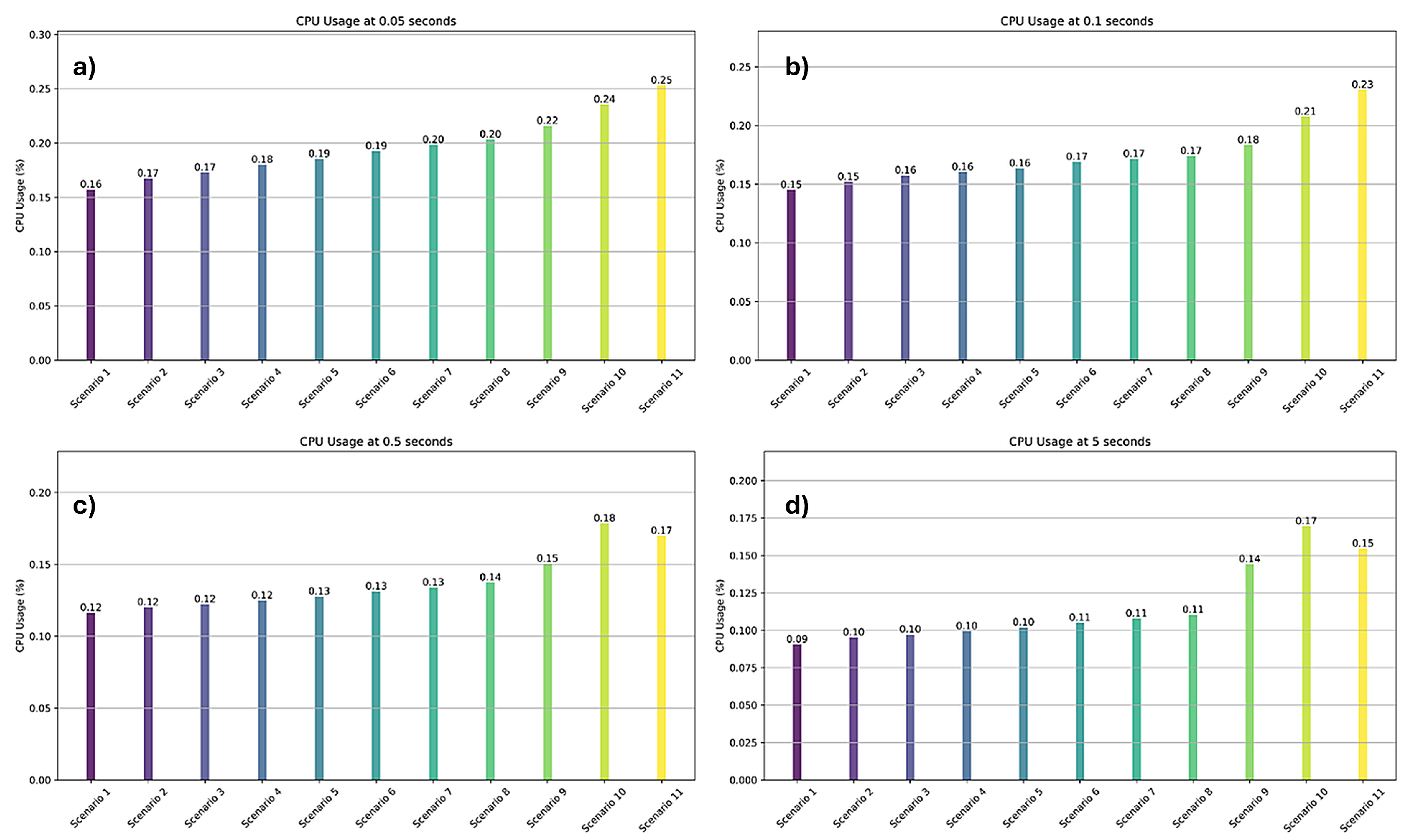 Figure 5 illustrates the average CPU usage across the 11 scenarios, showing the performance under varying device counts and data rates. Even in the most demanding configuration (Scenario 11 with 12,500 devices transmitting every 0.05 s), Neo4j maintained CPU usage under 0.25% of the system capacity.