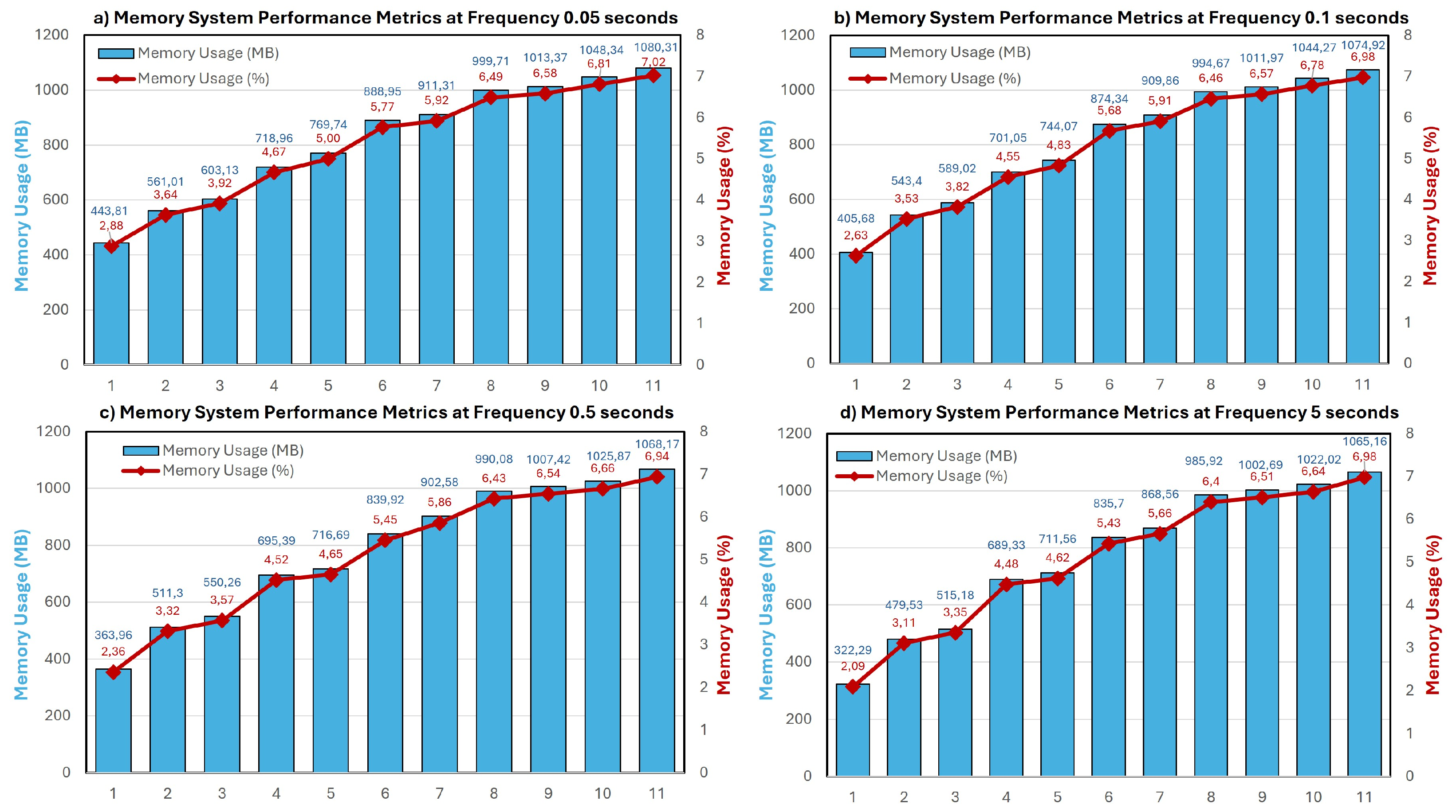 Figure 6 shows the memory consumption measured in megabytes and as a percentage of the total RAM. As expected, the memory usage scaled with the number of devices and transmission frequency. Higher ingestion rates require more memory to buffer and process data within a shorter time window.