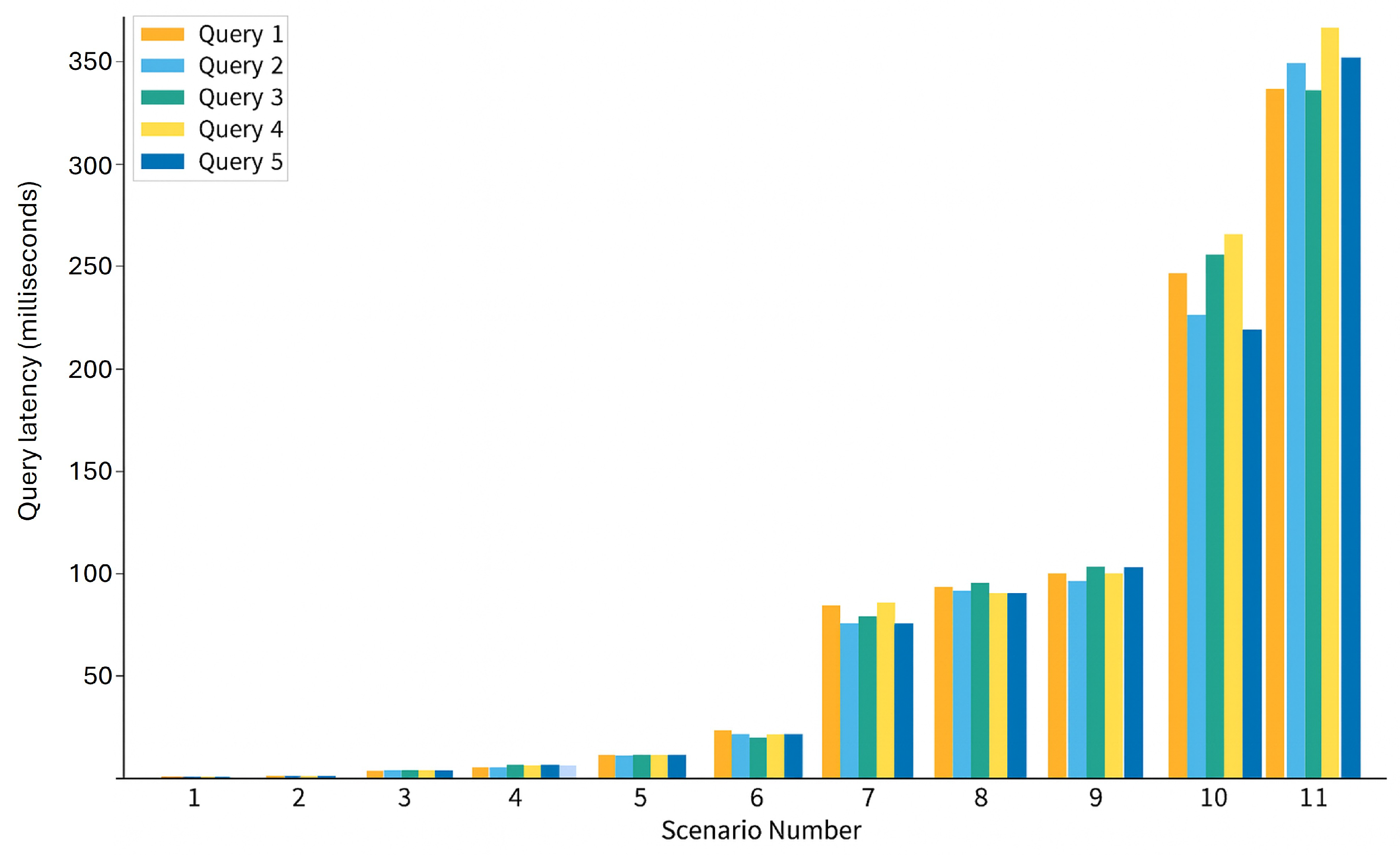 Figure 7 present the results of query latency. The query execution time increased with the dataset size across all scenarios. The latency increased by up to two orders of magnitude between Scenarios 1 and 11. This is expected given that scenario 1 has 5000 stored nodes and scenario 11 has 12 million nodes. This increase in nodes and relationships is responsible for the increased response time of Neo4j. Nevertheless, all queries were executed in less than 500 ms, meeting the latency requirements for real-time clinical applications.