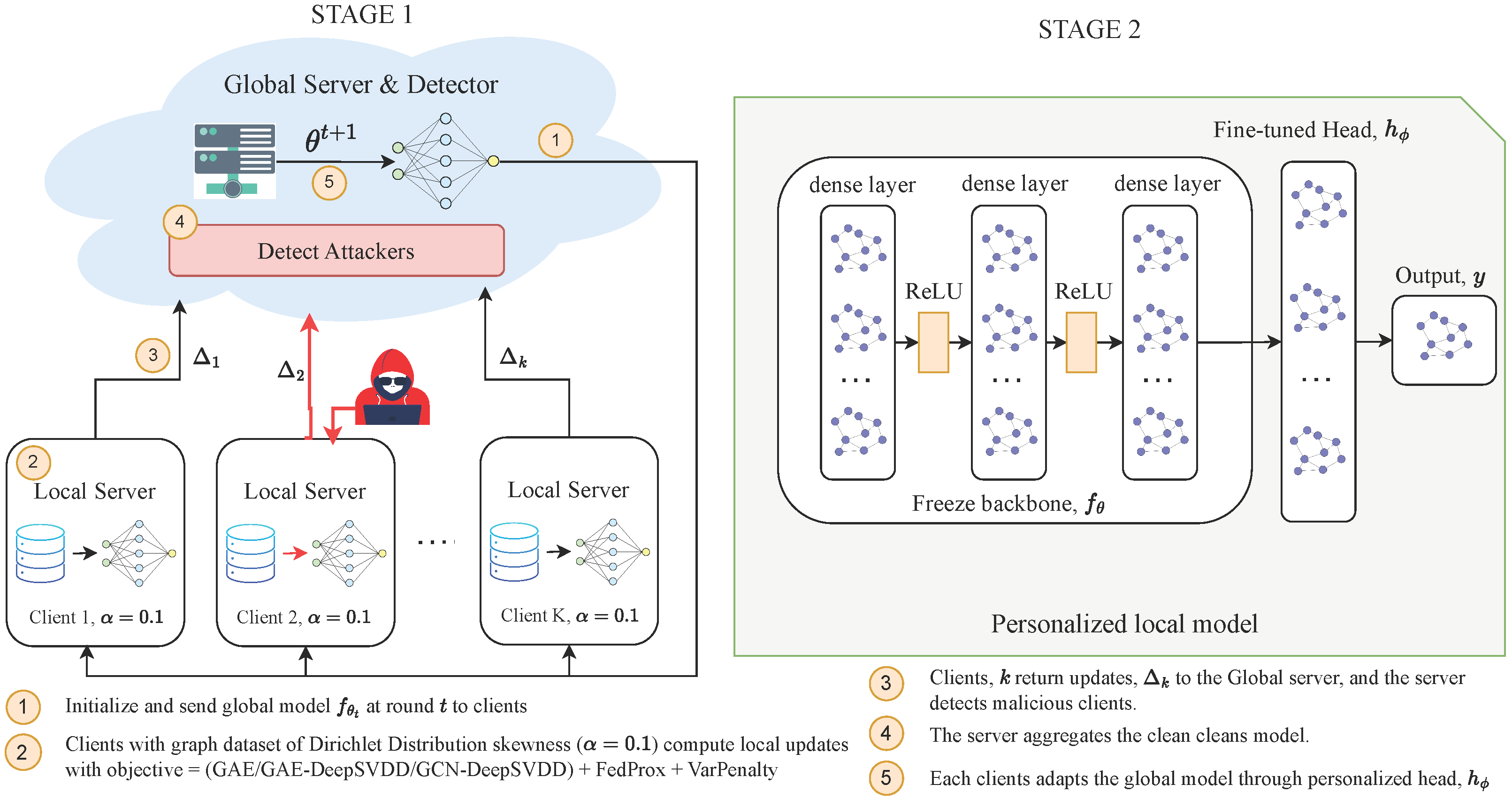 - Task-Specific Objective: Clients employ one of three graph-based architectures: GAE (Graph Autoencoder), GAE-DeepSVDD, or GCN-DeepSVDD, depending on the detection paradigm (reconstruction-based or hypersphere-based anomaly detection).