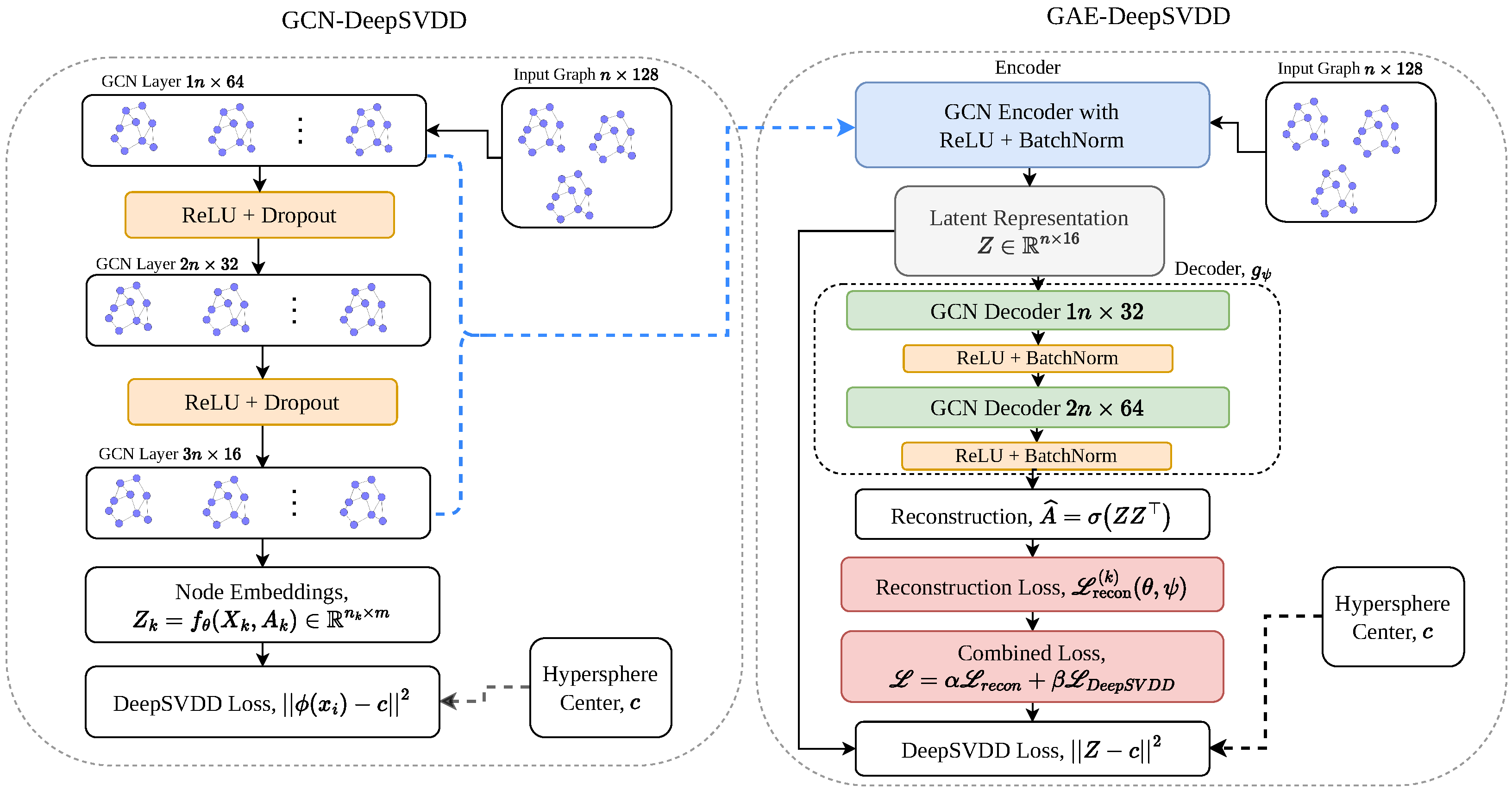 - We implement and evaluate two federated one-class graph encoders that are compliant to federated training and comparable under identical conditions. These are a graph-level GCN trained with a DeepSVDD objective, and a hybrid GAE–DeepSVDD that jointly optimises reconstruction and embedding compactness.
