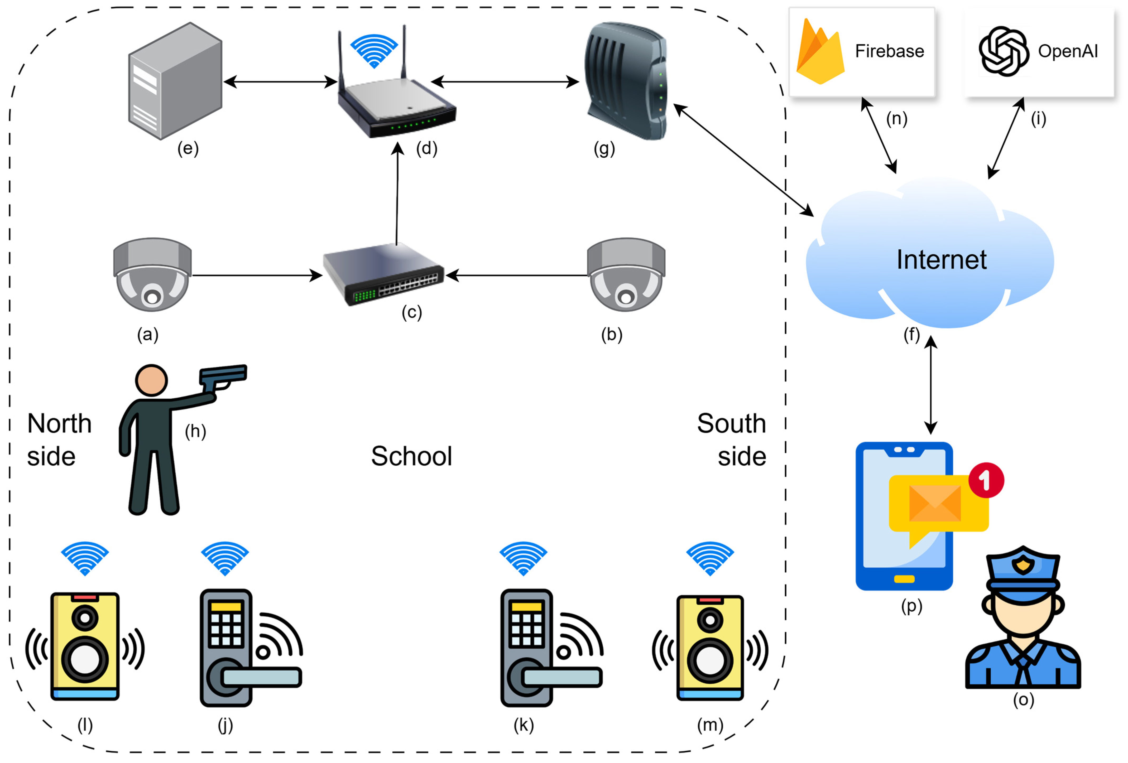 - Auto PA announcement: The system automatically announces using the PA system the location of where the gun is detected and also announce to move away from that area. For instance, if the gun is detected in the northside hallway, the people who are outside the classrooms will be automatically advised using the PA system to move towards the south. This is the current practice in schools, and automating this can save time and lives.