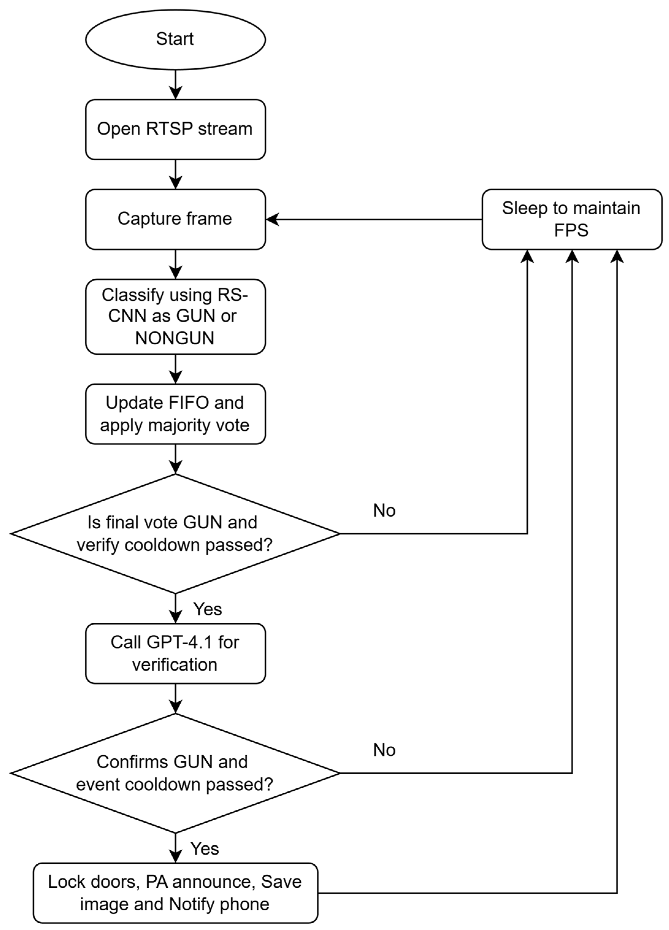 - Privacy: In [4], camera images are continuously transmitted to cloud-based servers for primary classification, enabling persistent third-party access and raising privacy concerns. In contrast, the proposed system performs all image and audio classification locally within the private network. Images are sent to an external vision model only as a secondary verification step and only when the local classifier detects a potential firearm with high confidence. This event-driven transmission is infrequent and limited to high-risk scenarios and contains the same visual information that is provided to first responders for situational awareness. Therefore, the system does not enable continuous external surveillance and preserves user privacy.