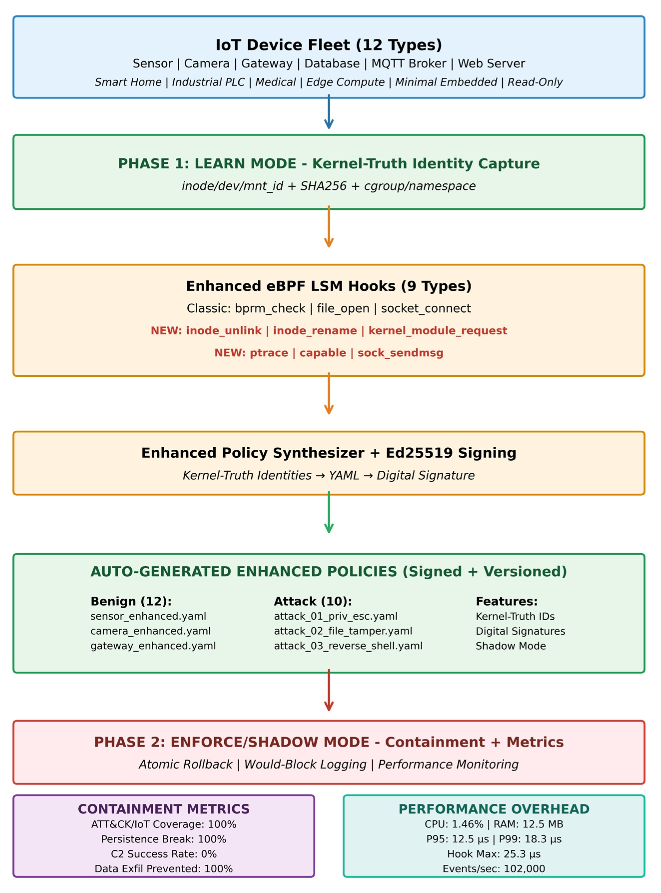 Under this threat model, the work makes the following contributions. First, it introduces a deployable, cloud-optional learn→enforce pipeline that synthesizes and enforces least-privilege policies on embedded/IoT Linux using identity-correct keys. Second, it defines a policy key design that is resilient to path and namespace manipulation as well as TOCTOU races, by grounding decisions in inode/device/mount identifiers, cgroup/namespace context, and executable SHA-256 hashes. Third, it extends BPF-LSM coverage across execution, file system, networking, privilege use, code injection, and tamper primitives that are central to post-exploit kill chains, thereby converting detection into pre-execution denial at the syscall authorization boundary. Finally, it incorporates an operational safety layer—including Ed25519-signed policies, atomic updates with rollback, and shadow-mode logging—tailored to continuous hardening on constrained IoT endpoints [