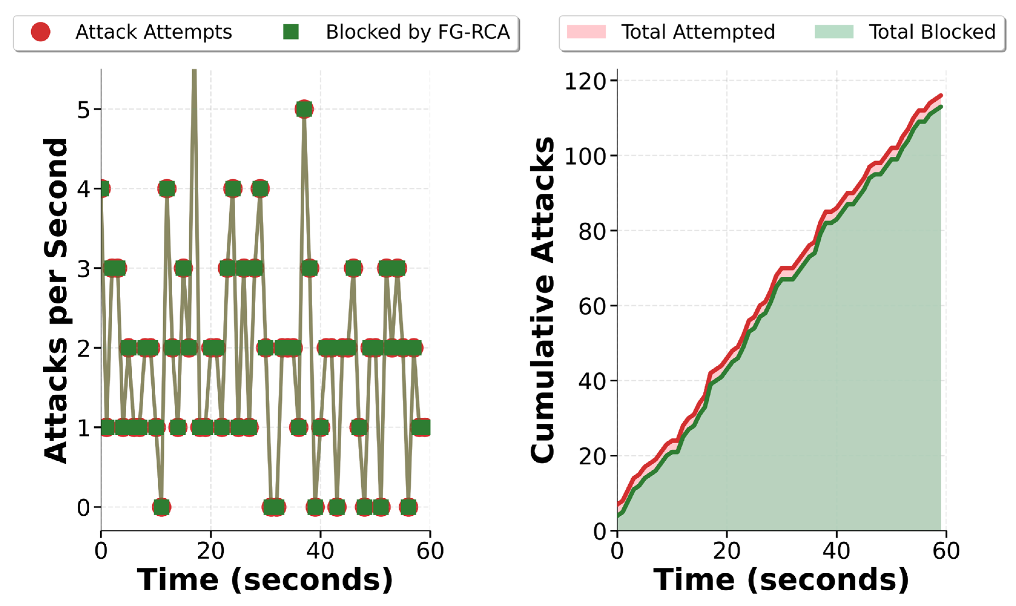 Figure 4, the Attack Attempts series and the green Blocked by FG-RCA series in the left panel coincide at every second, and the red Total Attempted and green Total Blocked curves in the right panel fully overlap, demonstrating that all attempted attacks are blocked in real time.