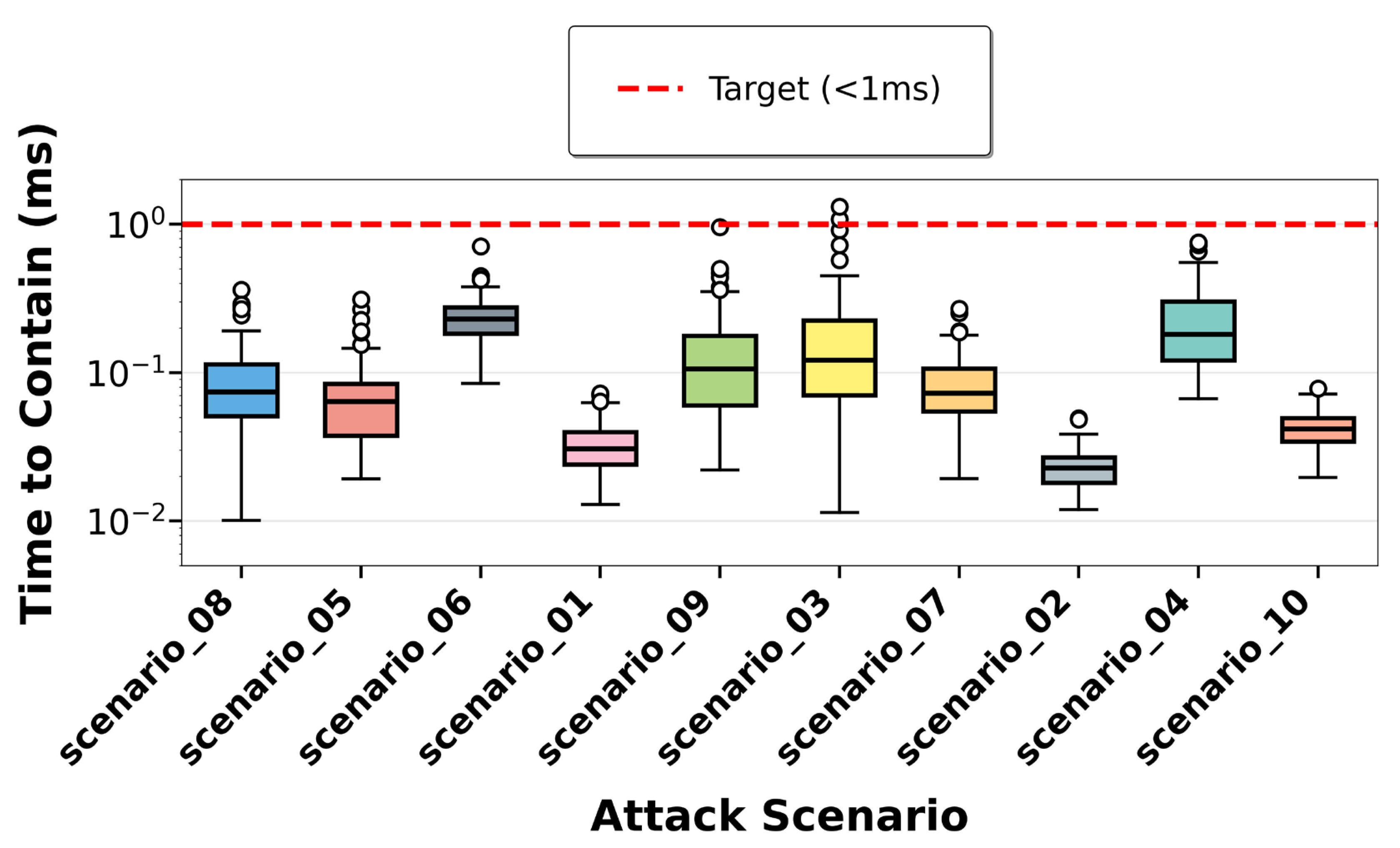 Box plots show the time-to-contain distribution for each scenario on a logarithmic scale. All scenarios maintain median response times well below the 1-ms target threshold (red dashed line). Scenario 02 (File System Tampering) demonstrated the fastest median containment time at approximately 0.02 ms, reflecting the efficiency of blocking simple memory access attempts. Scenario 04 (Lateral Movement) shows higher median response time (~0.15 ms) due to the complexity of tracking multi-host connection patterns, while Scenario 10 (Rootkit Installation) exhibits the widest variance due to the diverse kernel-level operations involved.