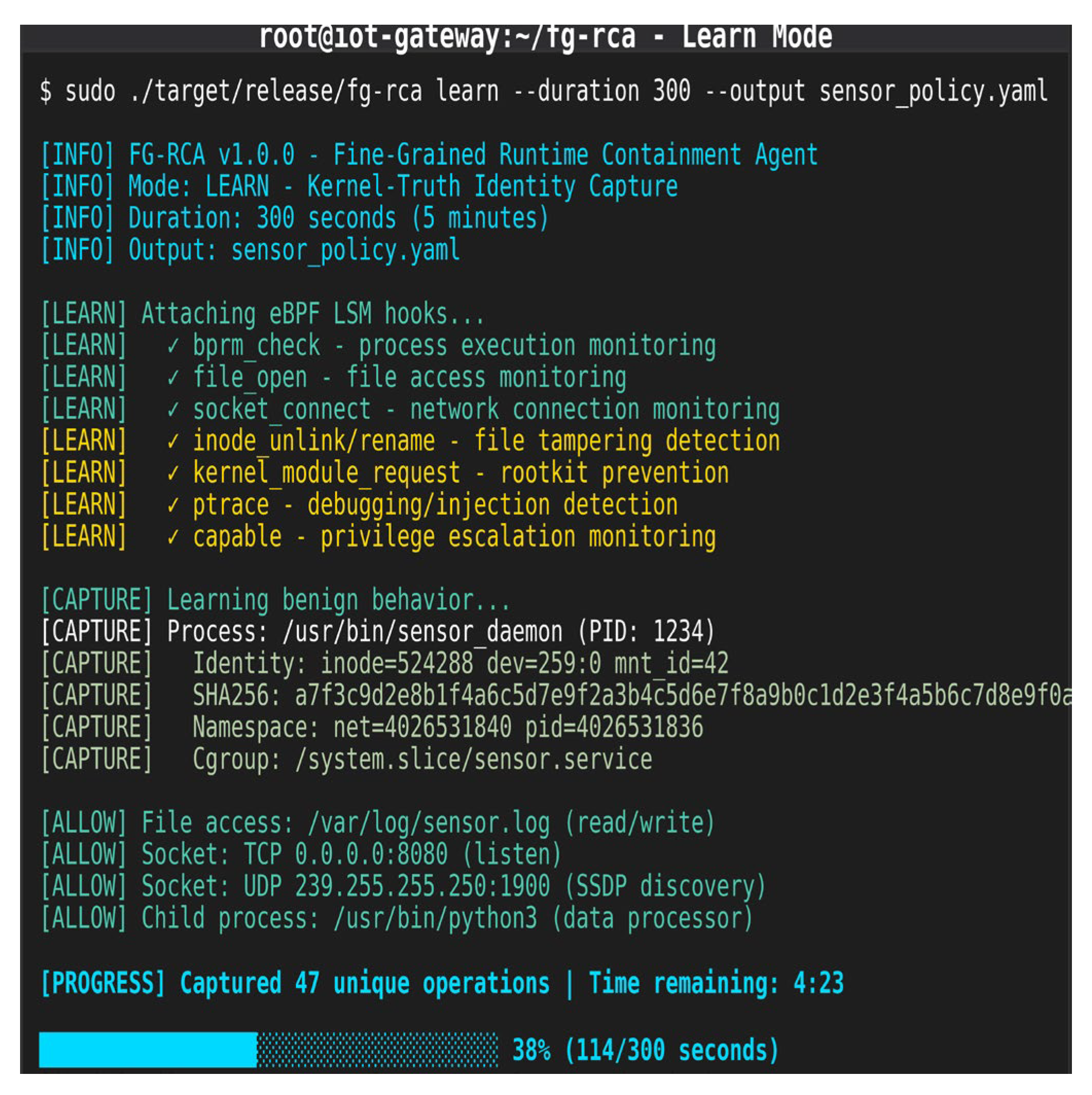 FG-RCA exposes two phases with operational safeguards. In Learn mode, LSM/eBPF probes emit security-relevant events to a Rust userspace agent, which aggregates benign traces and synthesizes role-specific, compact policies (process, file, network) sized for embedded footprints. In Enforce mode, a policy compiler verifies Ed25519 signatures, executes an atomic policy swap with automatic rollback on failure, and loads rule sets into eBPF maps; subsequent security-relevant operations are checked pre-execution and denied with -EPERM when disallowed [