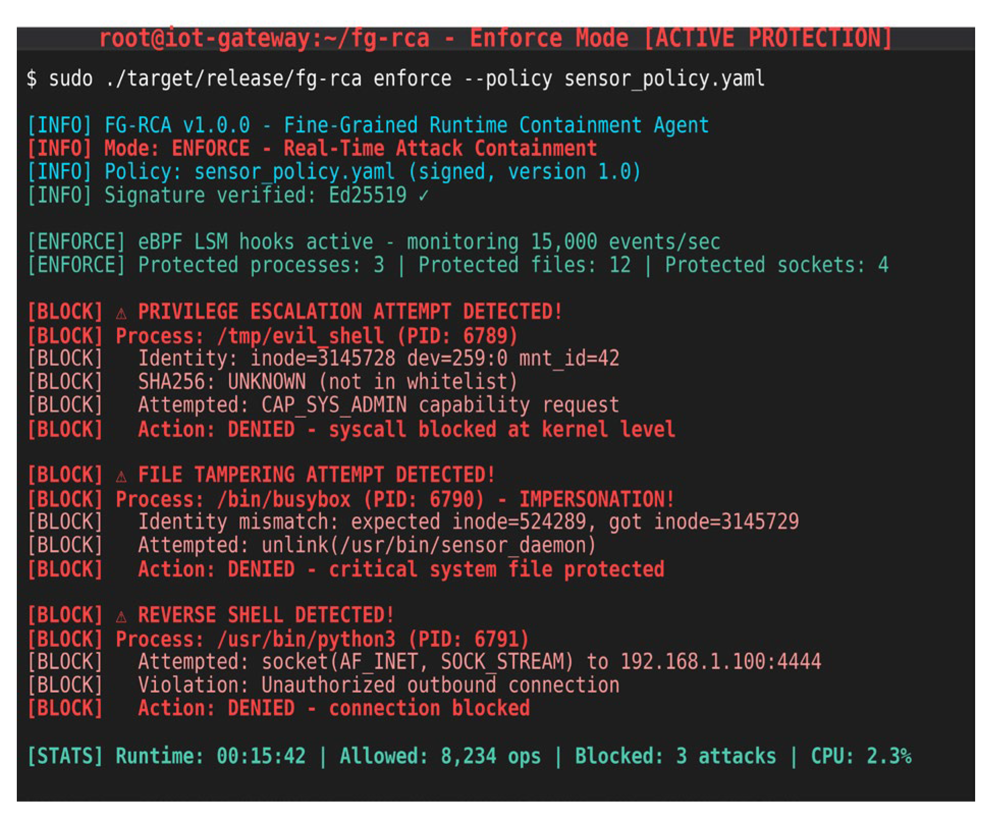 These security gains are achieved with overheads that remain compatible with constrained devices. The evaluation shows a CPU overhead of approximately 1.46%, additional memory usage of 12.5 MB, and a p95 syscall latency of 12.5 µs, while sustaining event throughputs above 100,000 events per second. Compared with traditional IDS configurations and virtualized isolation baselines, FG-RCA provides substantially lower CPU and memory impact while still delivering inline, pre-execution containment rather than detect-only alerts. This efficiency stems from constant-time BPF map lookups over compact identity keys, verifier-friendly program structure, and a clear separation between the hot-path enforcement plane in the kernel and the off-path learning and policy management in user space.