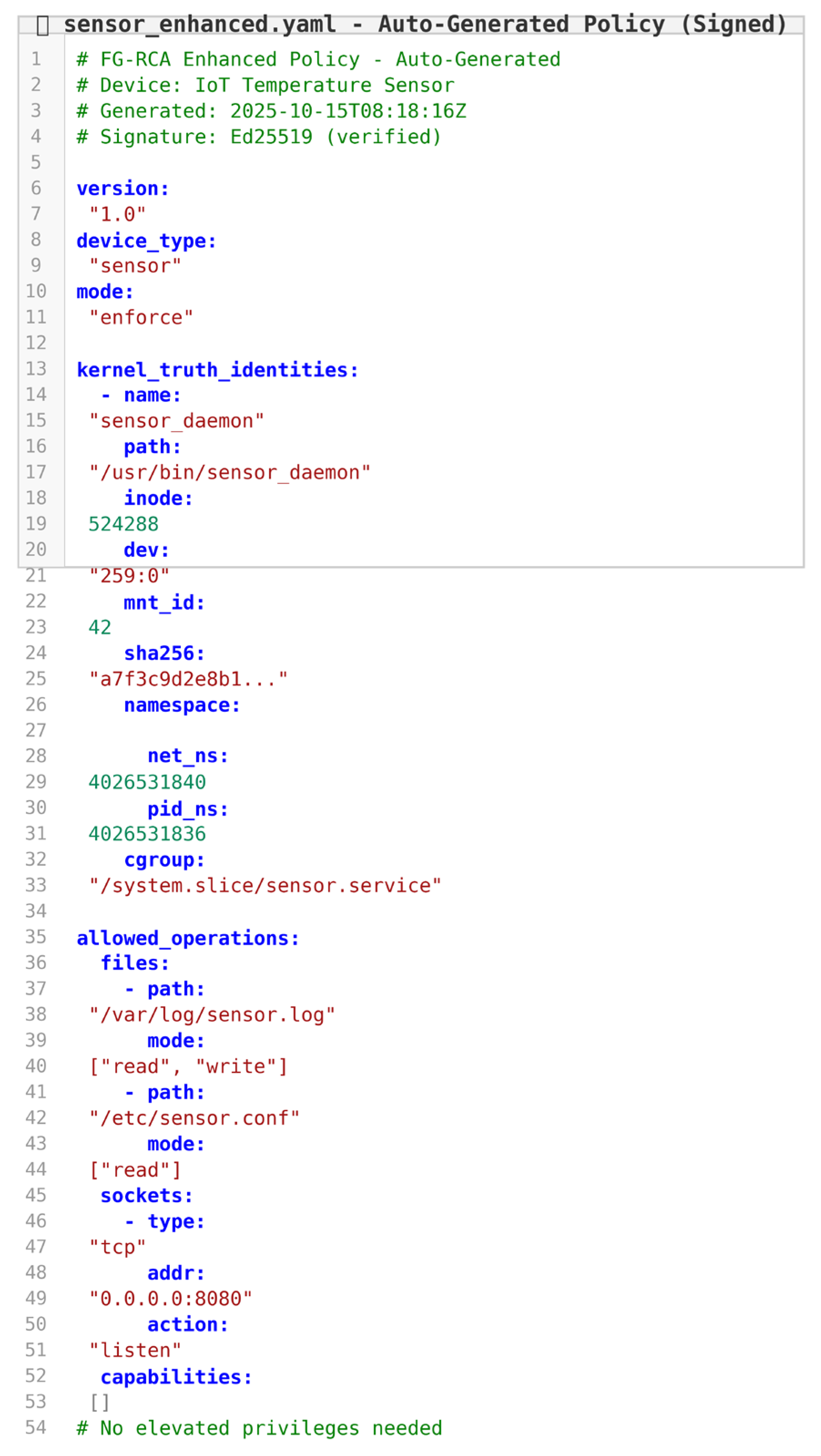 17], FG-RCA learns compact least-privilege allow-lists per device role and enforces them with constant-time map lookups, remaining within IoT-class CPU/memory budgets while preserving auditability.